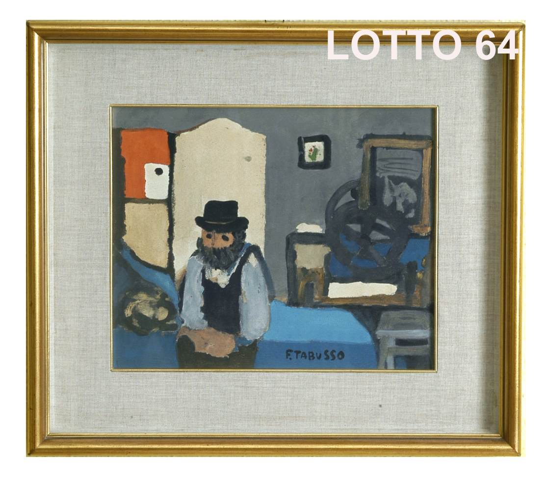 FRANCESCO TABUSSO (1930) DIPINTO OLIO SU TAVOLA RAFF. INTERNO CON VECCHIO...