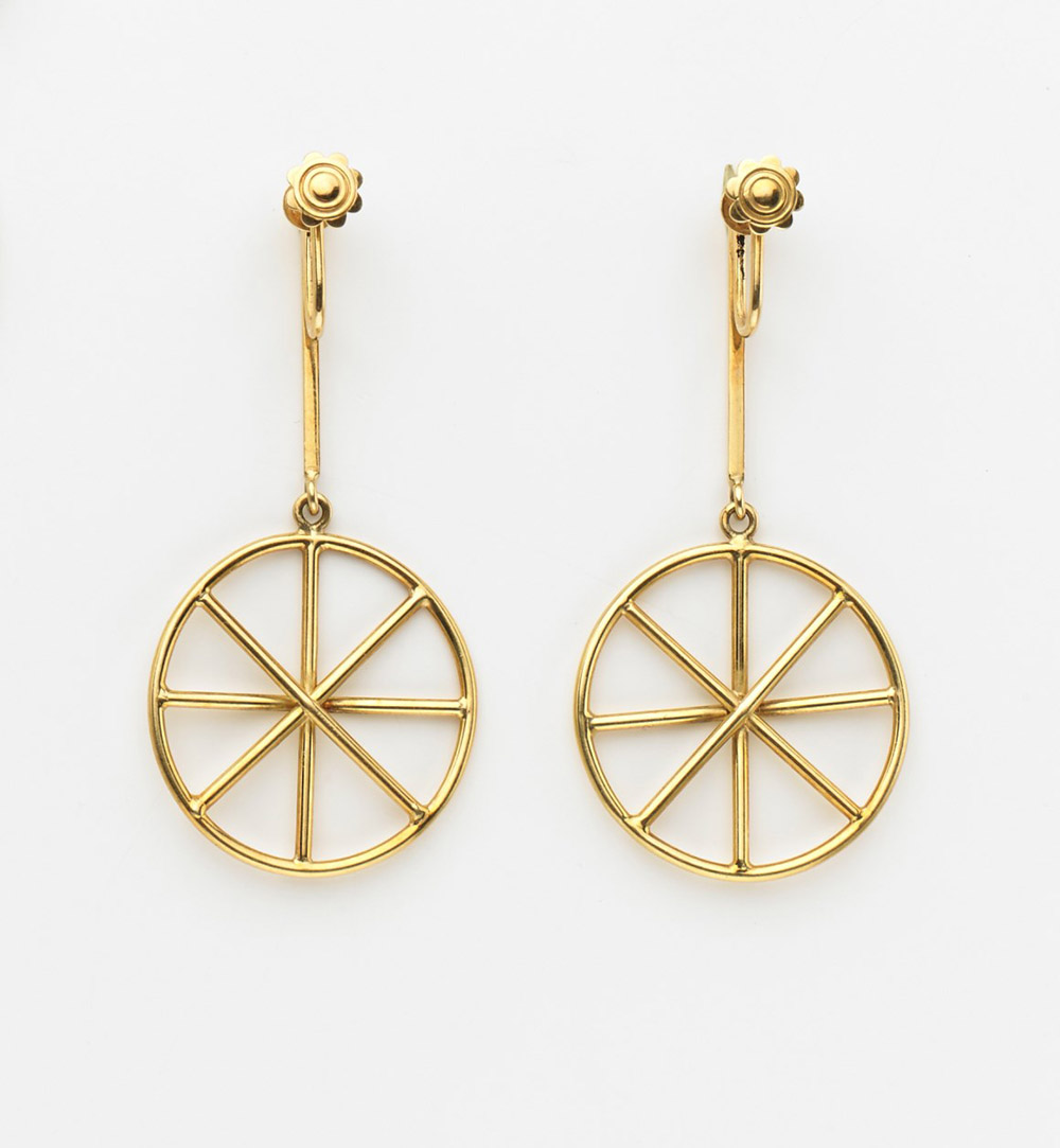 Fausto Melotti (Rovereto 1901 - Milano 1986) "Ruote" 1984 ca. orecchini in oro giallo 24 ct., cm 6x2,8 Prova d'artista Opera accompagnata da certificato di autenticità su fotografia rilasciato dall'Archivio Fausto Melotti, Milano, in data 26 luglio 2007, con il n. JEO 002 Fausto Melotti (Rovereto 1901 - Milano 1986) "Ruote" 1984 ca. yellow gold 24 ct. earrings, cm 6x2,8 Artist's proof Certificate of authenticity on photography by the Archivio Fausto Melotti, Milan, dated 26 July 2007, with nr. JEO 002
