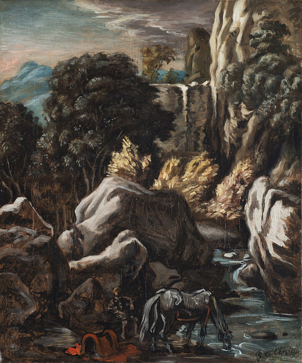 Giorgio De Chirico (Volos 1888 - Roma 1978) "Guerriero in riposo con cavallo che beve in una pozza (Tranquility)" 1938-39 olio su tela, cm 55x46 Firmato in basso a destra Provenienza Collezione privata, Milano Esposizioni "De Chirico" N.M. Acquavella Galleries, New York, marzo 1947, n. 12 ill. in catalogo Opera accompagnata da certificato di autenticità su fotografia rilasciato dalla Fondazione Giorgio e Isa de Chirico, Roma, in data 28 giugno 1996 con il n. 399/1996 Giorgio De Chirico (Volos 1888 - Roma 1978) "Guerriero in riposo con cavallo che beve in una pozza (Tranquility)" 1938-39 oil on canvas, cm 55x46 Signed lower right Provenance Private collection, Milan Exhibited "De Chirico", N.M. Acquavella Galleries, New York, marzo 1947, n. 12 ill. in catalogo Certificate of authenticity on photography by the Fondazione Giorgio e Isa de Chirico, Rome, dated 28 June 1996 with nr. 399/1996