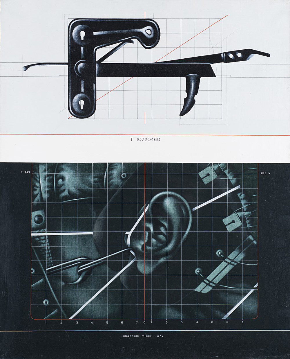 Sergio Sarri (Torino 1938 - 0) "Progetto d'attrezzo e schermo" 1973 acrilico su tela, cm 100x80 Firmato, titolato e datato 1973 al retro Provenienza Collezine privata, Milano Sergio Sarri (Torino 1938 - 0) "Progetto d'attrezzo e schermo" 1973 acrylic on canvas, cm 100x80 Signed, titled and dated 1973 on verso Provenance Private collection, Milan