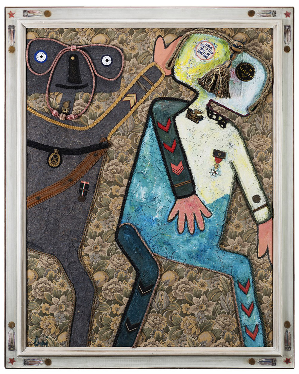 Enrico Baj (Milano 1924 - Vergiate 2003) "Le comte de Hornes, Seigneur des Pays-Bas et Guillaume IX de Nassau" 1965 olio, collage, passamaneria, oggetti, decorazioni e mostrine, cm 146x114 Firmato in basso a sinistra Provenienza Galleria Schwarz, Milano Collezione privata, Milano Esposizioni "Baj e Cavaliere" Galleria Narciso, Torino, 19 ottobre - 6 novembre 1966, cat. n.27 "Enrico Baj" Galerie Vaclava Spaly, Praga, maggio 1969, cat. n.11 ill. "Enrico Baj. Retropective" Museum of Contemporary Art, Chicago, 11 settembre - 24 ottobre 1971, cat. n.41 ill. Bibliografia "Baj" Milano, Mauri Editore, 1969, ill. (part.) E. Crispolti "Catalogo Generale dell'opera di Enrico Baj" Torino, Bolaffi, 1973, p.148, n.1011 ill. Enrico Baj (Milano 1924 - Vergiate 2003) "Le comte de Hornes, Seigneur des Pays-Bas et Guillaume IX de Nassau" 1965 oil, collage, cloth, objects, decorations and medals, cm 146x114 Signed lower left Provenance Galleria Schwarz, Milan Private collection, Milan Exhibited "Baj e Cavaliere" Galleria Narciso, Torino, 19 ottobre - 6 novembre 1966, cat. n.27 "Enrico Baj" Galerie Vaclava Spaly, Praga, maggio 1969, cat. n.11 ill. "Enrico Baj. Retropective" Museum of Contemporary Art, Chicago, 11 settembre - 24 ottobre 1971, cat. n.41 ill. Literature "Baj" Milano, Mauri Editore, 1969, ill (part.) E. Crispolti "Catalogo Generale dell'opera di Enrico Baj" Torino, Bolaffi, 1973, pag.148, n.1011 ill.