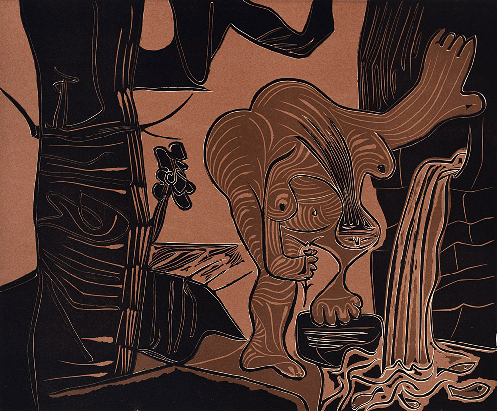 Pablo Picasso (Malaga 1881 - Mougins 1973) "Femme nue à la source" 1962 incisione a colori su linoleum, h cm 52,7x63,7 Firmata in basso a destra e numerata es. 37/50 Pablo Picasso (Malaga 1881 - Mougins 1973) "Femme nue à la source" 1962 linoleum-cut, cm 52,7x63,7 Signed lower right and numbered 37/50