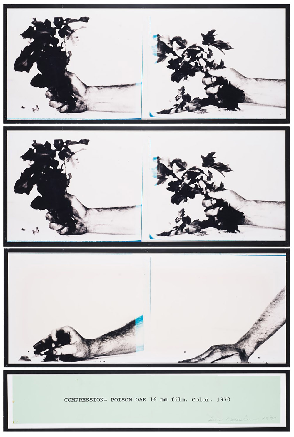 Dennis Oppenheim (Electric City 1938 - New York 2011) "Compression. Poison Oak" 1970 pellicola a colori 16 mm, opera composta da 4 elementi (3 elementi 50x125, 1 elemento 21x120) Firmato e datato 1970 Provenienza Collezione privata, Milano Opera accompagnata da certificato di autenticità su fotografia rilasciato dall'artista Dennis Oppenheim (Electric City 1938 - New York 2011) "Compression. Poison Oak" 1970 coloured film 16 mm, work of 4 pieces (3 pieces 50x125, 1 piece 21x120) Signed and dated 1970 Provenance Private collection, Milan Certificate of authenticity on photography by the artist