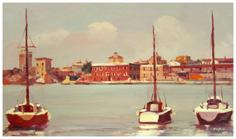 ALFONSO PAPI Castellina Marittima 1931 Il porto di Livorno 1973 Olio su tela 40 x 70. Firma in b. a d.; sul verso data, firma e titolo. B.A.: 150
