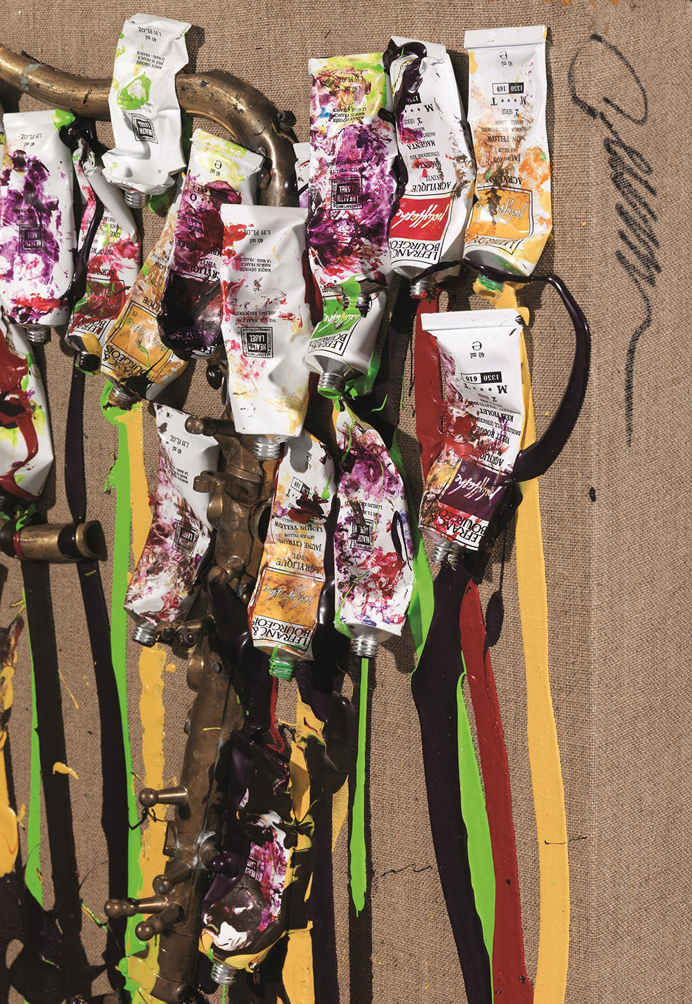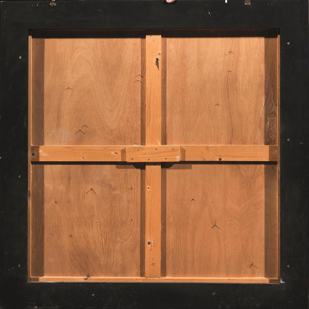 olio e assemblaggio su tela applicata su tavola, cm 100x100