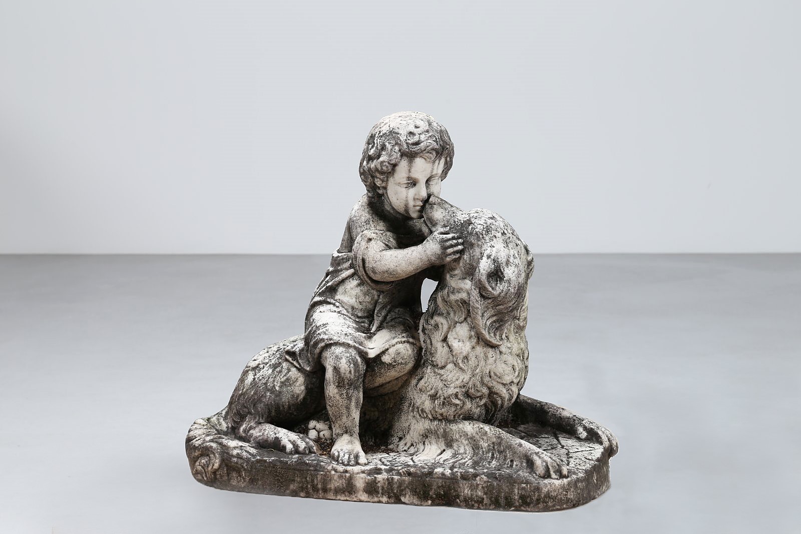 MANIFATTURA ITALIANA DEL XIX SECOLO Bimbo con cane in marmo bianco. . Cm 75,00 x 67,00 x 30,00.