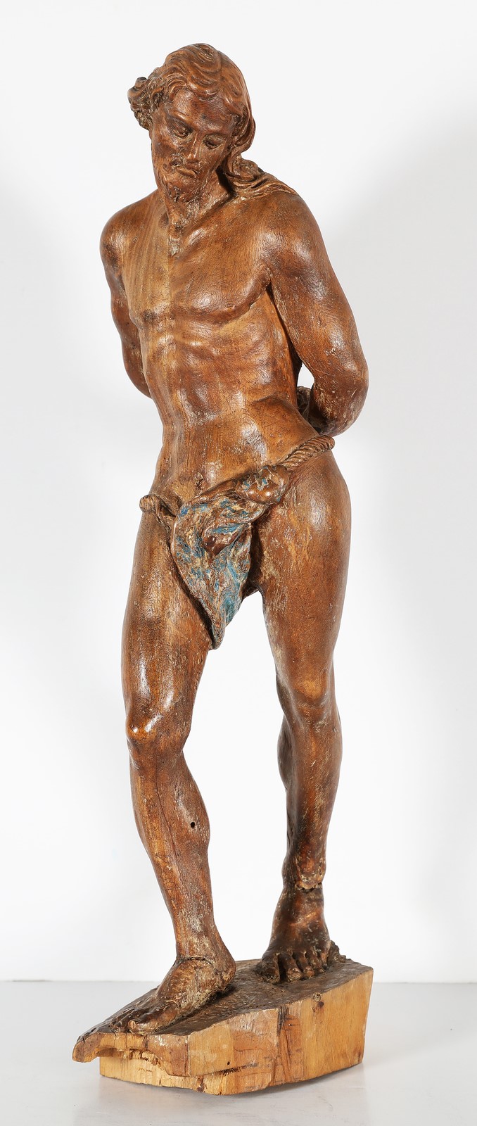 ARTISTA DEL XVI SECOLO Scultura in legno raffigurante nudo d'uomo. . Cm 15,00 x 46,50 x 10,00. Alla base etichetta Lorenzellii Antichità, Bergamo. Tracce di policromia.