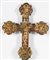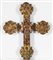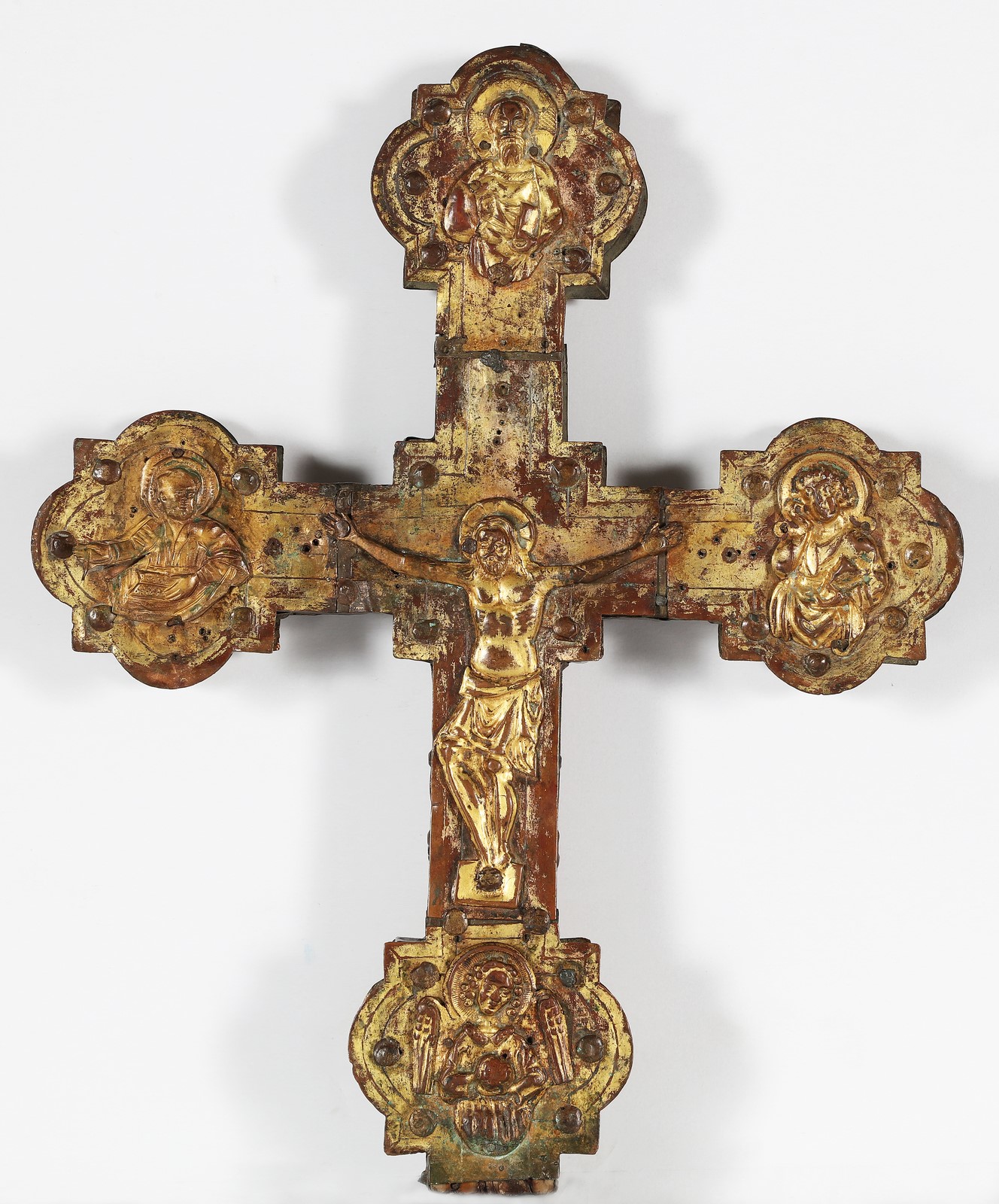 ARTISTA DEL XVI SECOLO Croce Stilofila. Al fronte Cristo in croce con i quattro evangelisti. Al verso San Giovanni Battista con il Tetramorfo. bronzo dorato. Cm 21,00 x 26,00. Presente cofanetto. Provenienza Acquistato dall'attuale proprietario presso la Galleria Lorenzelli, Bergamo L'opera propone i tipici tratti stilistici delle croci scolpite in bronzo o legno, ossia il personaggio principale al centro, sia al fronte e al retro, e i personaggi secondari posti alle estremità della Croce. Al fronte vi è rappresentato Cristo crocifisso, mentre alle estremità sono presenti quattro figure identificabili probabilmente con i quattro Evangelisti. Al verso invece vi è rappresentato al centro San Giovanni Battista con i suoi tipici attributi iconografici, ossia la veste di pelli, il bastone e la mano indicante Cristo, mentre alle estremità ci sono i simboli degli Evangelisti che formano il Tetramorfo.