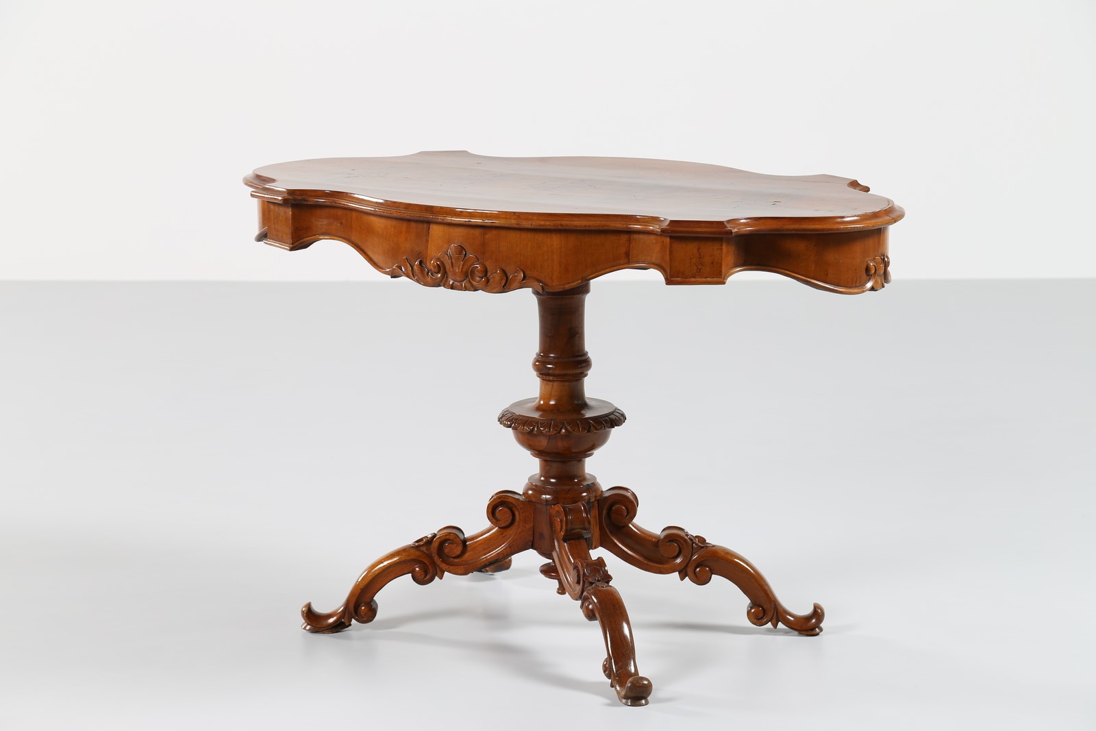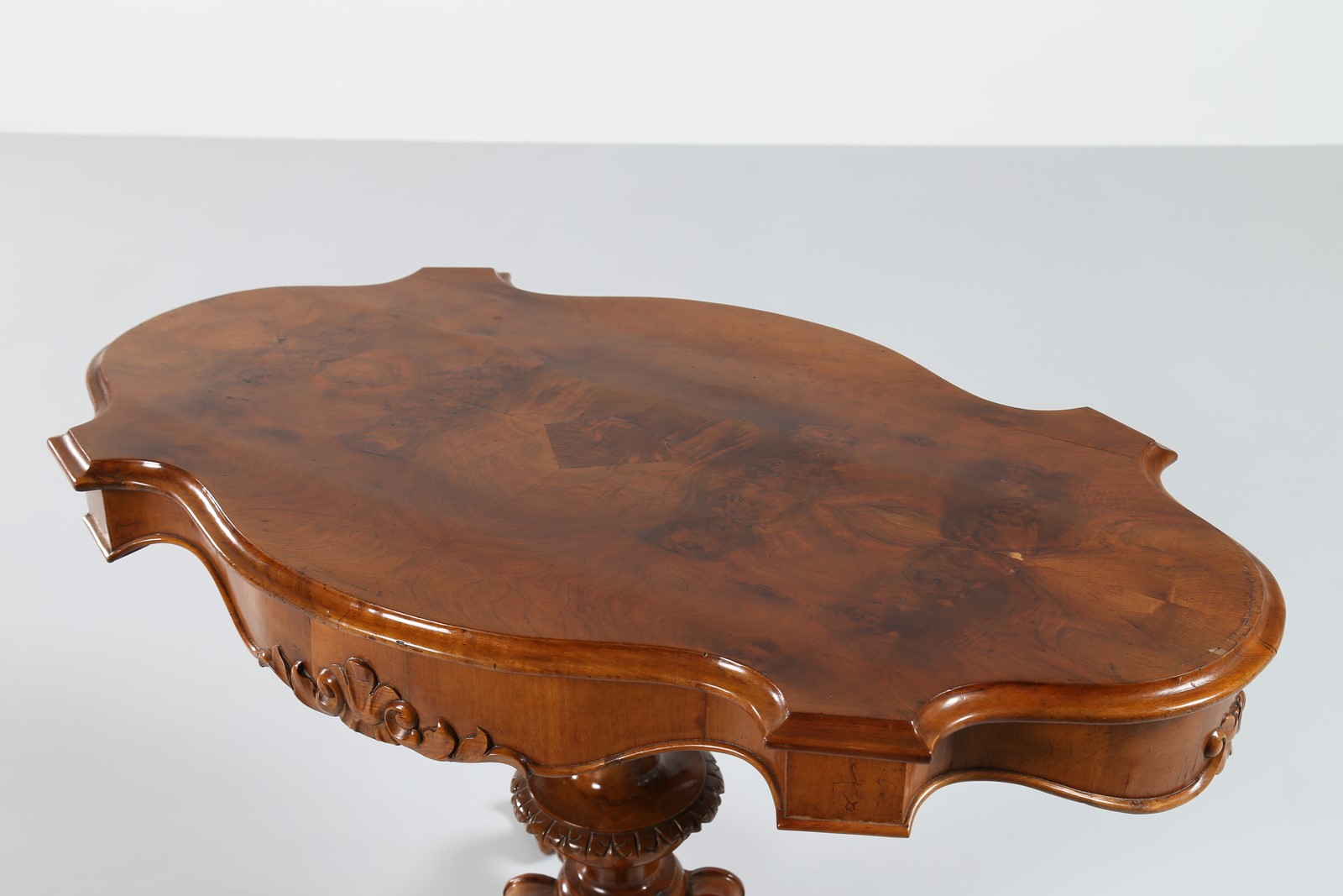 MANIFATTURA LOMBARDA DEL XIX SECOLO Tavolo sagomato e radicato in legno di noce. . . Cm 121,00 x 80,00 x 71,00. Periodo Luigi Filippo.