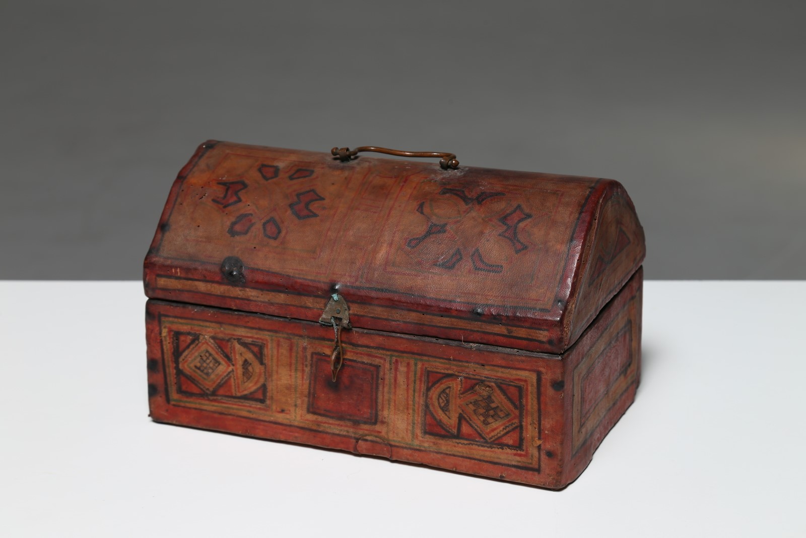 MANIFATTURA ITALIANA DEL XVII SECOLO Scrigno in legno e pelle decorata a motivi geometrici. . Cm 16,00 x 26,00 x 16,00.