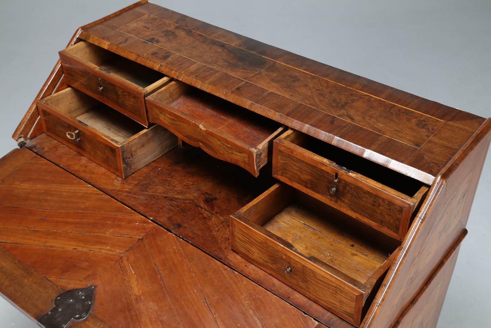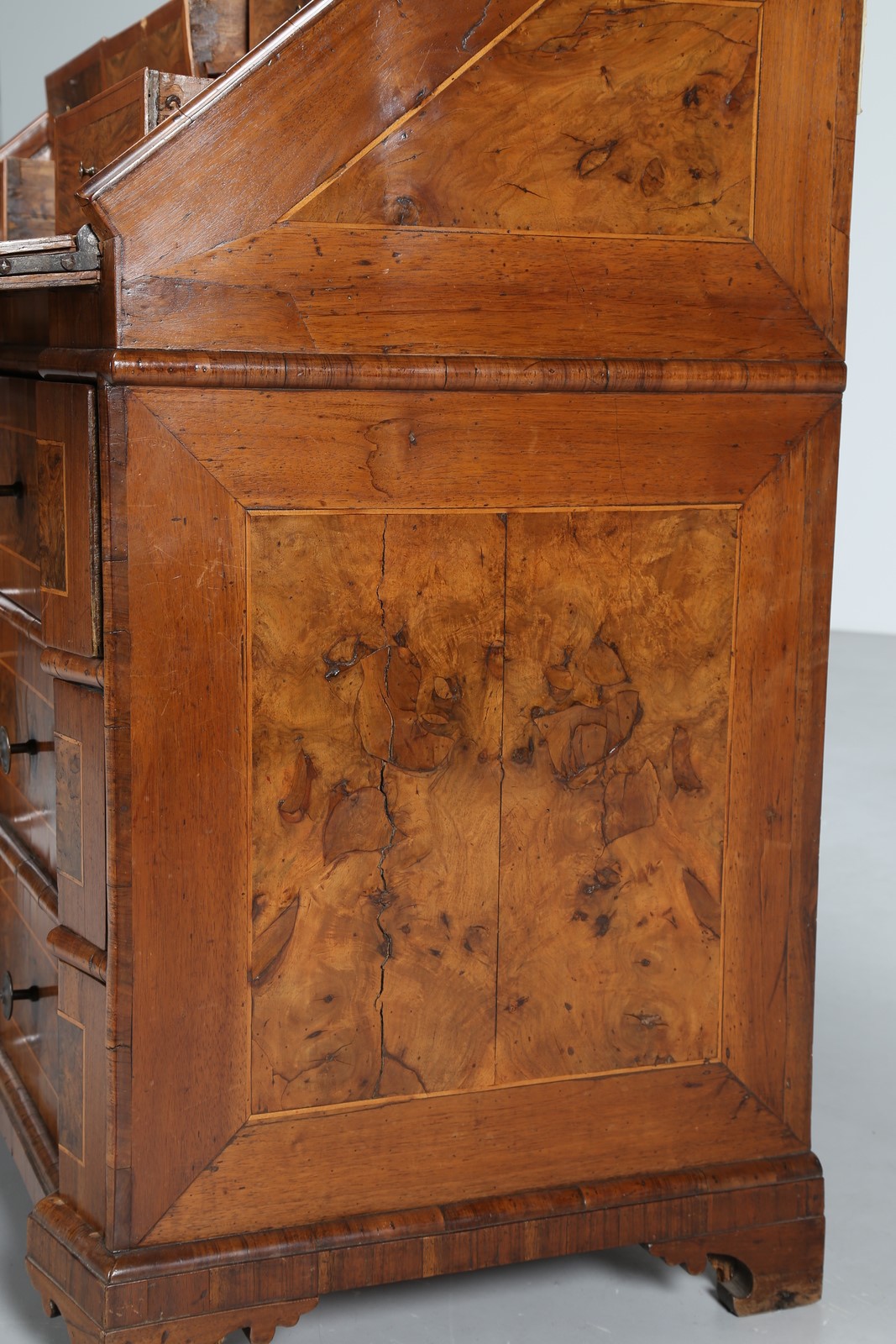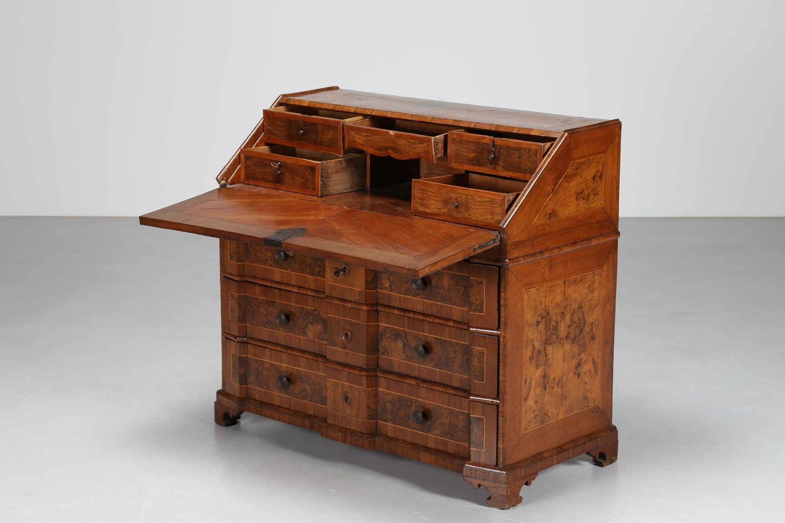 MANIFATTURA VENETA DEL XVIII SECOLO Ribalta a tre cassetti radicata in legno di noce, fronte mosso. Legno e radica. Cm 115,00 x 106,00 x 58,00. Condizioni ottime, patina dell'epoca.