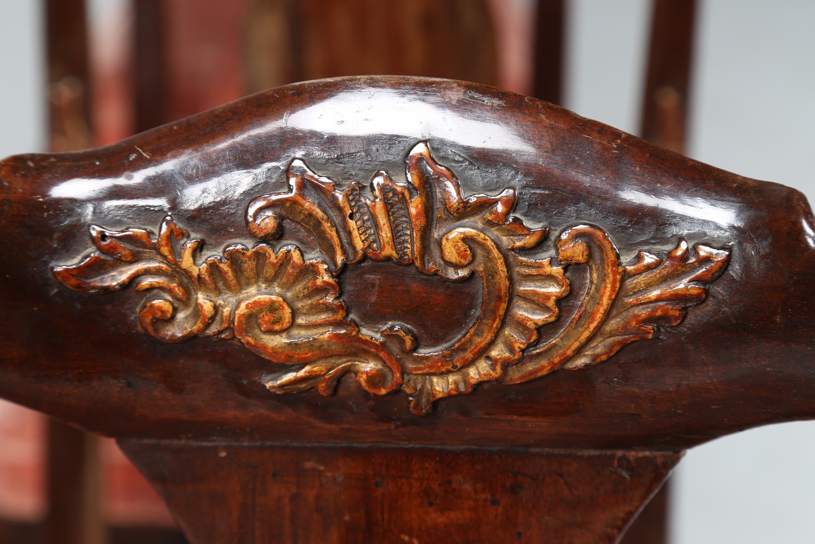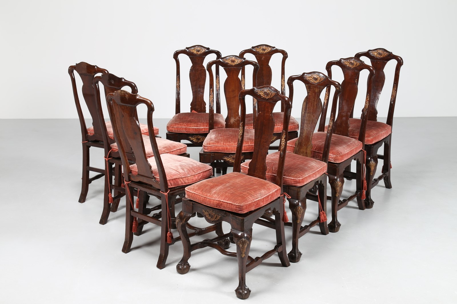 MANIFATTURA TOSCANA DEL XVIII SECOLO Gruppo di 10 sedie in legno di noce, schienale sagomato, gambe rastremate. . Cm 53,00 x 107,00 x 52,00. In ottime condizioni.