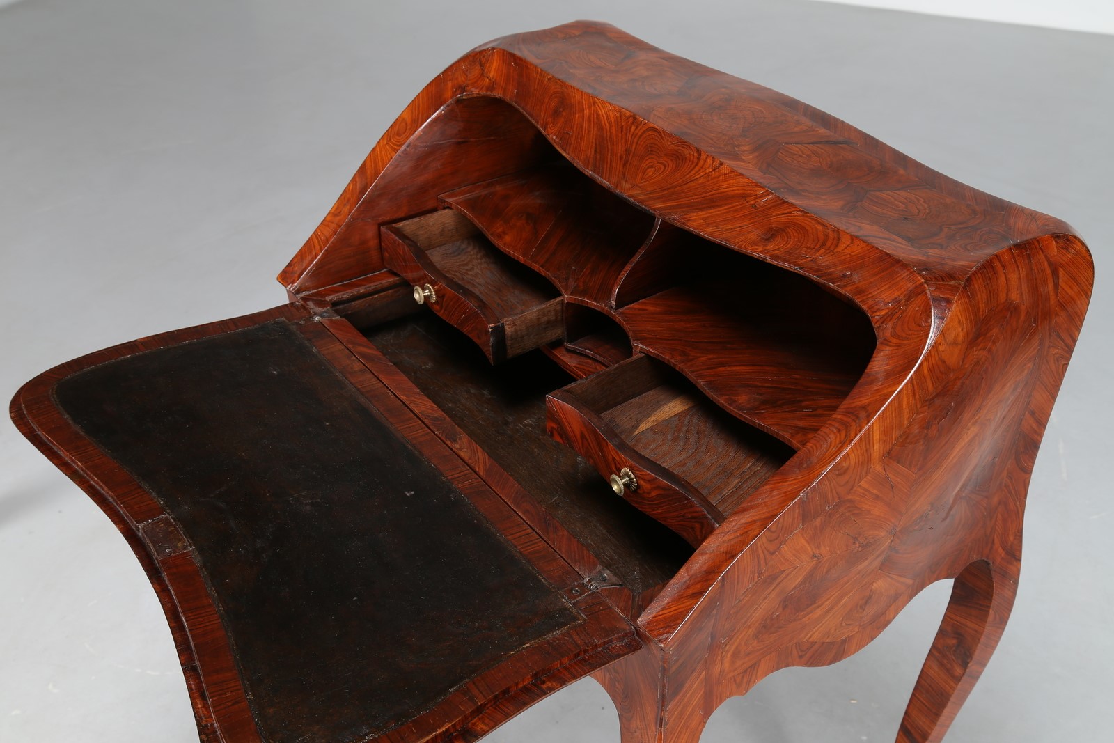 MANIFATTURA FRANCESE DEL XVIII SECOLO Ribaltina lastronata in legni pregiati, gambe arcuate, periodo luigi XV. . Cm 65,00 x 90,00 x 45,00. Presenta all'interno una stampiglia con dicitura Delorme JME. Già sotheby's Parigi, 9 novembre 2010, lotto n 54: nella descrizione del lotto non era riportata la presenza della stampiglia.