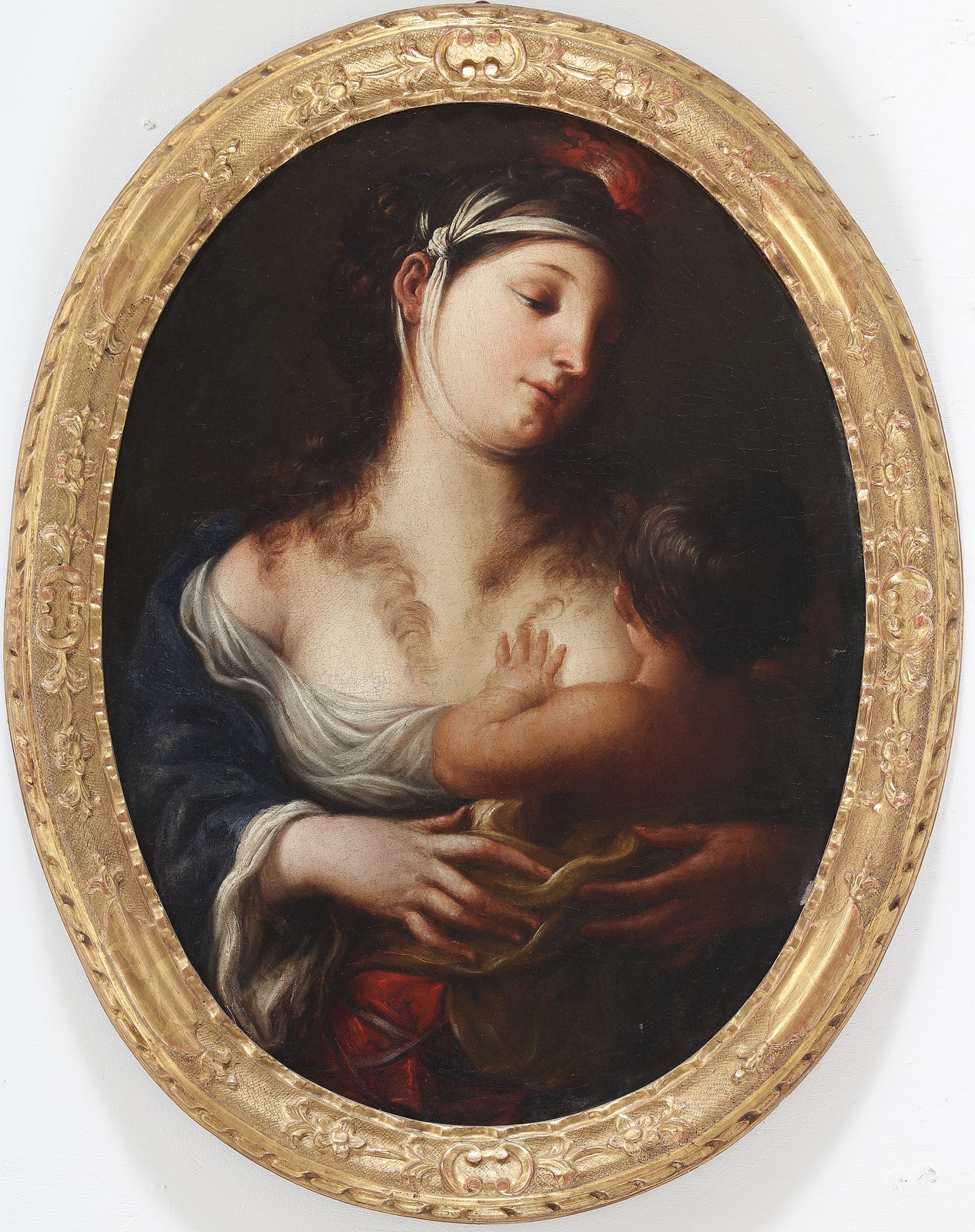 RICCHI PIETRO (1605 - 1675) Allegoria della Carità. olio su tela ovale. Cm 47,00 x 66,00. Ritroviamo la tipologia della donna in varie opere del pittore. Si veda,a proposito, la figura a sinistra della Madonna con Bambino e SS. Caterina e Orsola della Chiesa di S. Lorenzo di Bergamo. E' questa Allegoria della Carità uno dei lavori migliori del Ricchi, si ritiene eseguito nel periodo veneziano intorno al 1660, cioè vicino come tempo all'Adorazione dei Magi di S. Pietro di Castello. Il Ricchi rappresentò a Venezia una corrente di idealismo formale nutrito da linfe del barocco lombardo che s'opponeva al naturalismo dei tenebrosi, assimilando però nel contempo molti elementi della nuova pittura rappresentata da alcuni grandi maestri. il dipinto è accompagnato da un expertise di Egidio Martini. Cornice presente