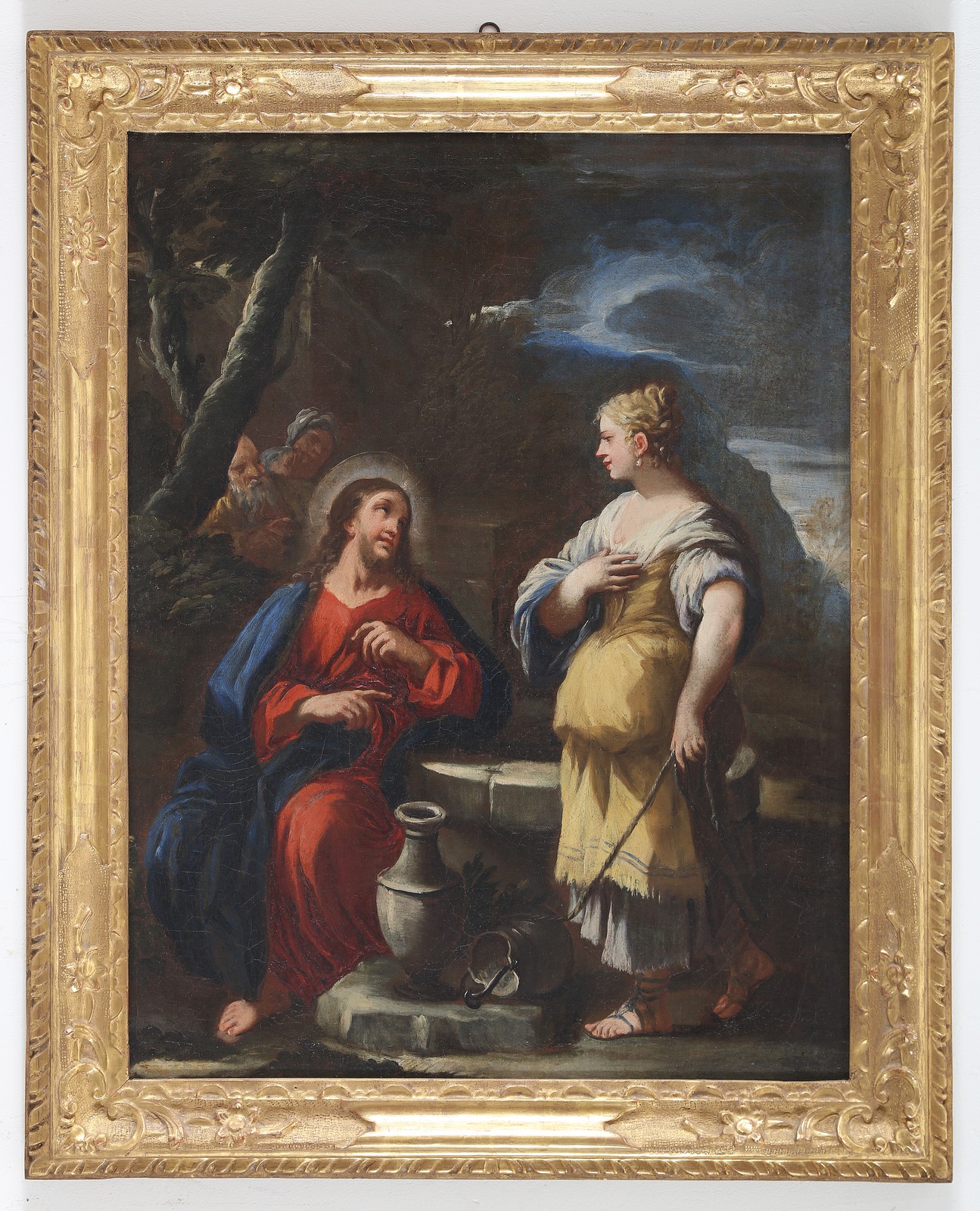 ARTISTA NAPOLETANO DEL XVII SECOLO Gesù e la samaritana. Olio su tela. Cm 50,00 x 64,00. . Cornice presente