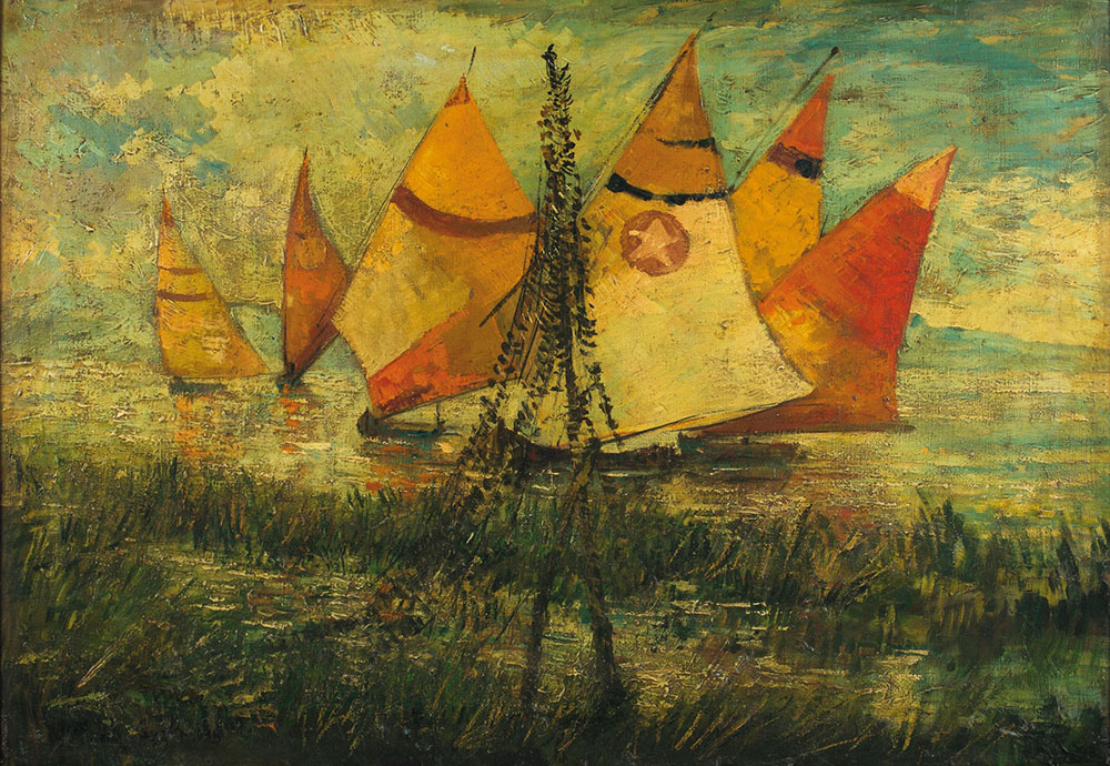 Michele Cascella (Ortona 1892-Milano 1989), Vele sul fiume Pescara, 1935, olio su tela, cm 60x87,5 firmato e datato in basso a sinistra