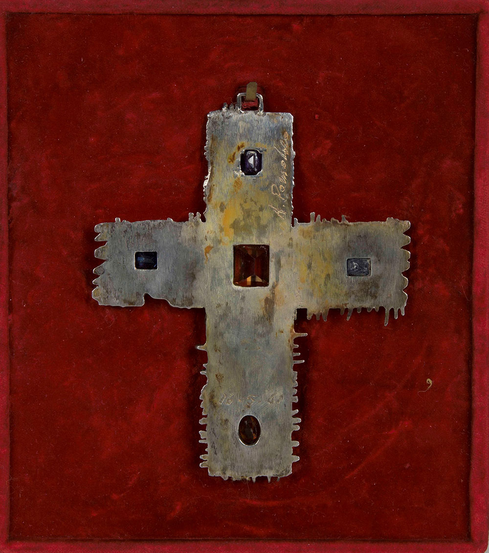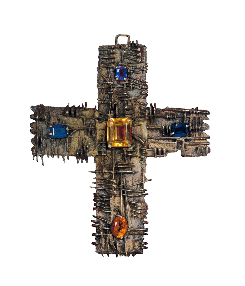 Arnaldo Pomodoro (1926), Croce pendantif, 1961, argento e pietre semi preziose, cm 12x10 circa Esemplare unico, Registrata presso l’archivio della Fondazione Arnaldo Pomodoro con la sigla G/61/28b