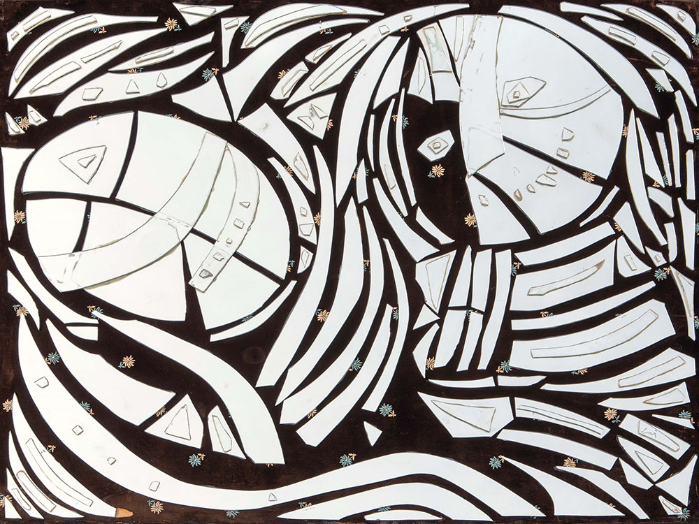 Enrico Baj (1924-2003), Specchio, 1974, collage di specchi su velluto applicato su tavola, cm 118x151 Edizione di 100 e di X Es. I/X Al retro: etichetta con dedica, numerazione e firma