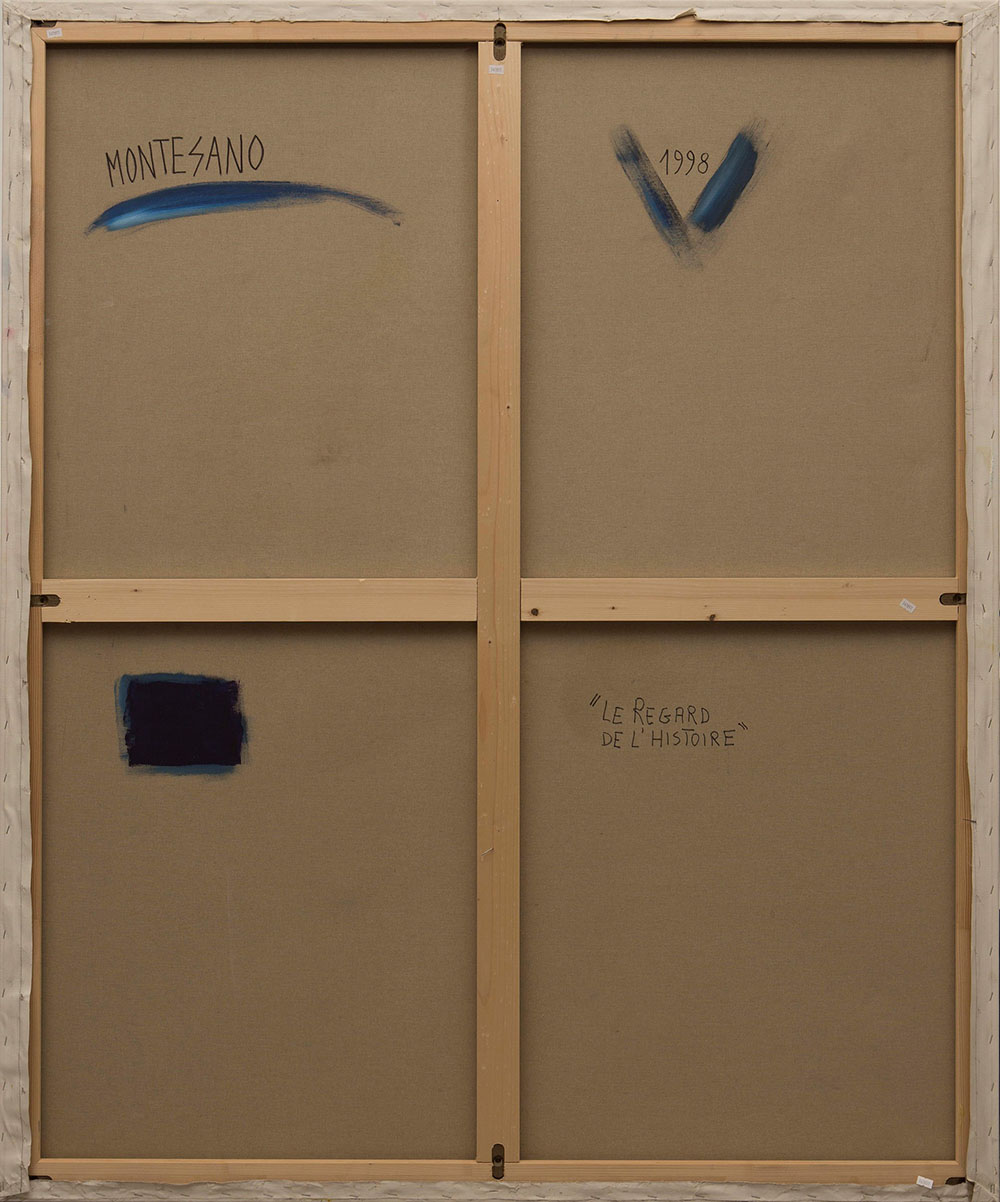 Gian Marco Montesano (1949), Le regard de l'histoire 1998, olio su tela, cm 169x139 firmato, datato e intitolato al retro Autentica dell'artista su fotografia