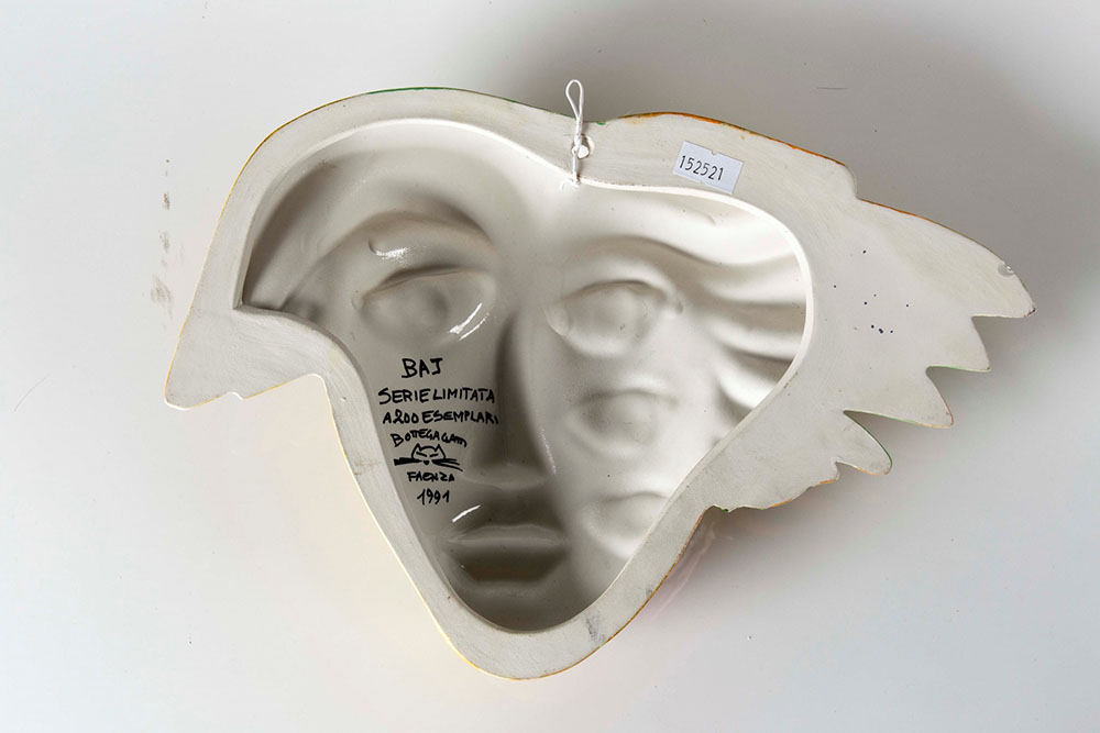 Enrico Baj (1924-2003), Maschera, 1991, bassorilievo in maiolica policroma, cm 30x20 serie limitata di 200 esemplari, Bottega Gatti, Faenza al retro