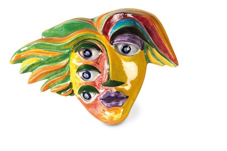 Enrico Baj (1924-2003), Maschera, 1991, bassorilievo in maiolica policroma,...