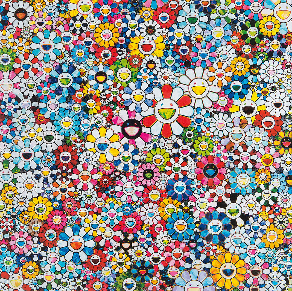 Takashi Murakami (1962), Flowers with smiley faces 2013, grafica, cm 50x50 firmato e numerato in basso a destra, 84/300 Ed. Kai Kai Kiki Factory, Tokyo