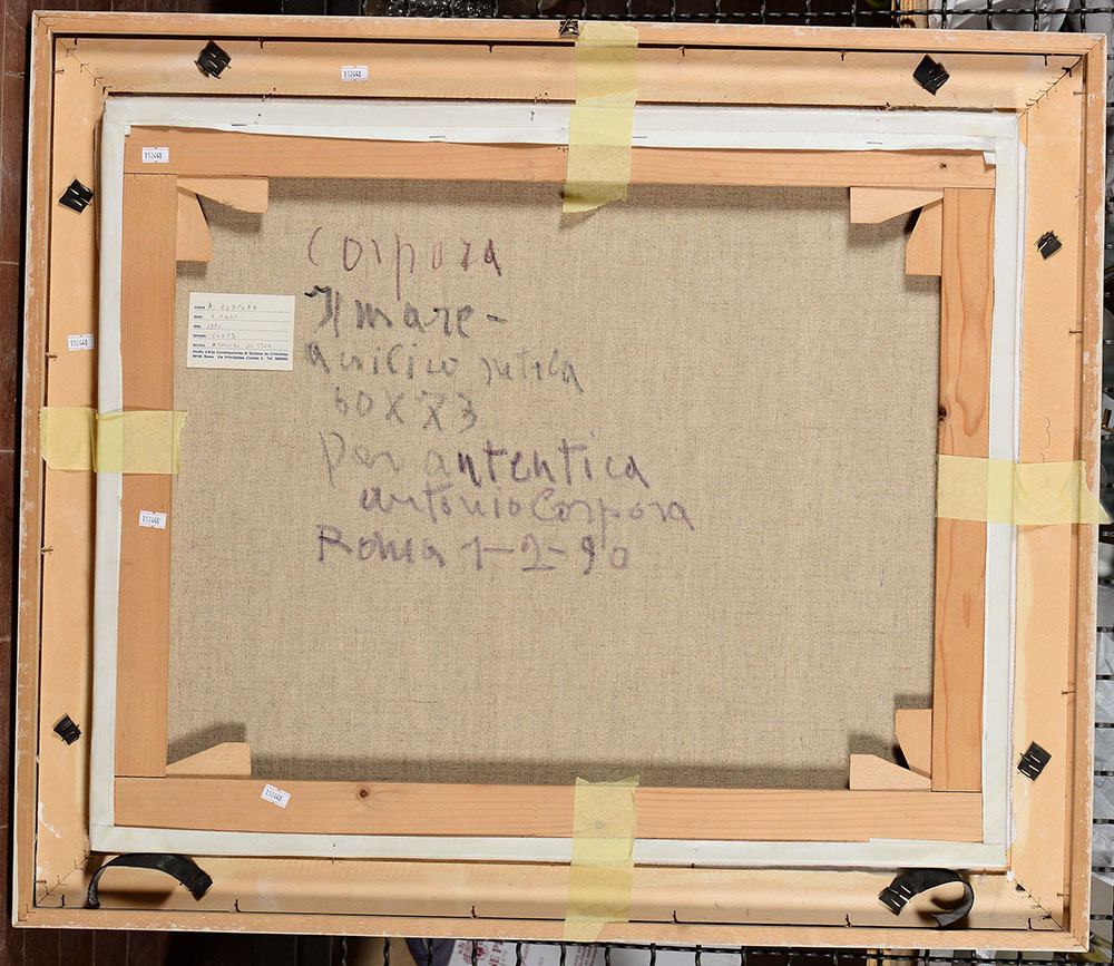 Antonio Corpora (1909-2004), Il mare, 1990, acrilico su tela, cm 60x73 firmato in basso a destra firmato, datato e intitolato al retro Opera registrata presso l'Archivio Antonio Corpora L’opera verrà pubblicata nel secondo Catalogo Generale Ragionato a cura di Giovanni Di Summa Timbro e firma al retro della Galleria Arte Contemporanea di Giuliana De Crescenzo, Roma