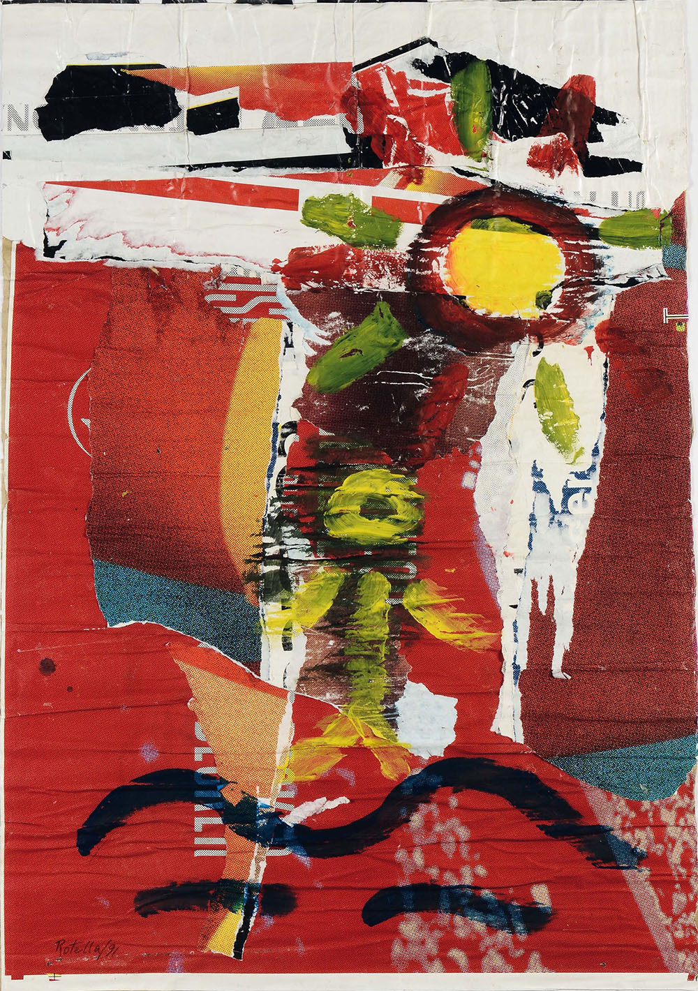 Mimmo Rotella (1918-2006), Vacanze, 1991, décollage, cm 100x70 firmato e datato in basso a sinistra firmato, datato e intitolato al retro Autentica su fotografia dell’artista in data 09/11/1991 Timbro e firma Galleria A. Consorti, Roma