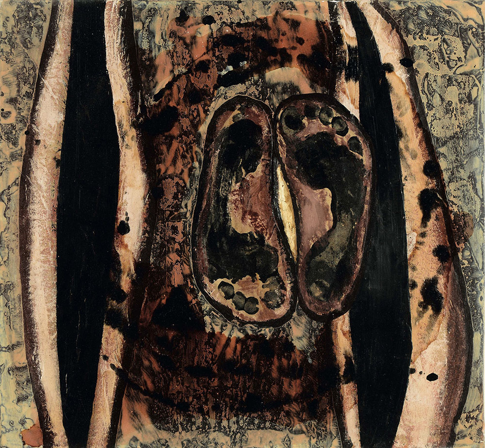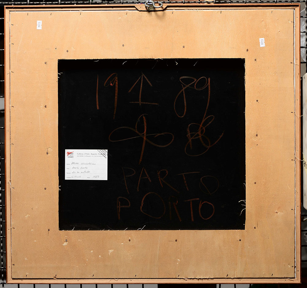 Bruno Ceccobelli (1952), Parto Porto, 1989, olio su metallo, cm 51x55 datato, siglato e intitolato al retro Autentica su fotografia della Galleria A. Consorti, Roma Etichetta Galleria A. Consorti, Roma,