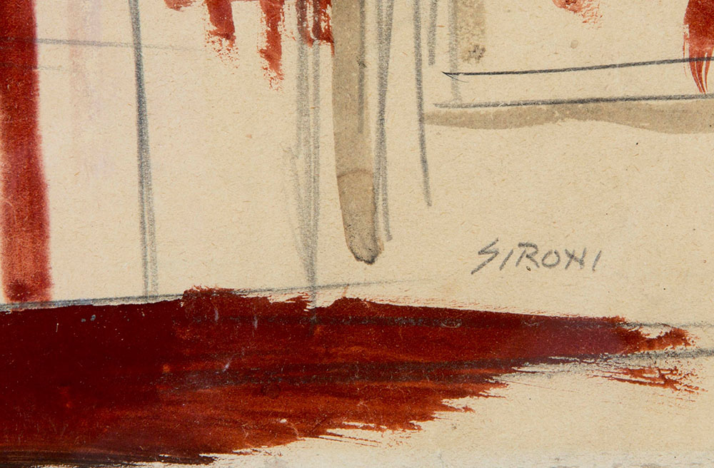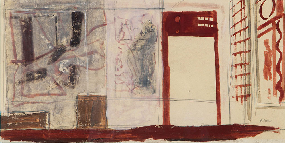 Mario Sironi (1885-1961), Studio per interno decorato, metà anni '30, tempera, matita grassa e matita su carta applicata su cartone, cm 27,5x53,8 firmato in basso a destra Opera archiviata presso l’Associazione per il Patrocinio dell’opera di Mario Sironi, con il n. 95/15 RA in data 21/07/2015
