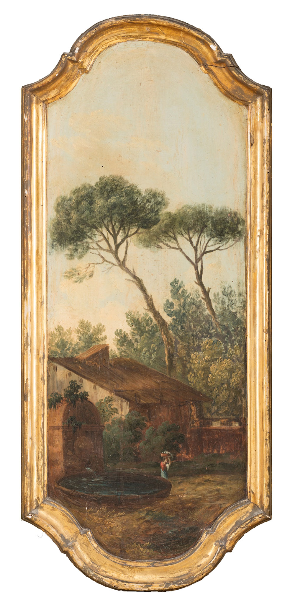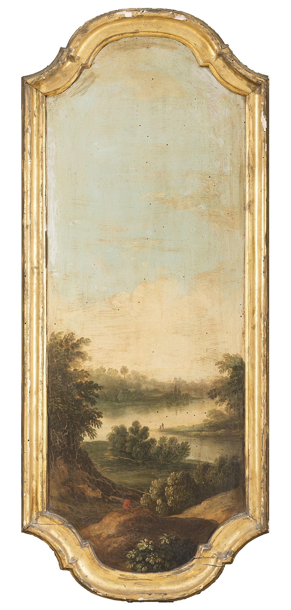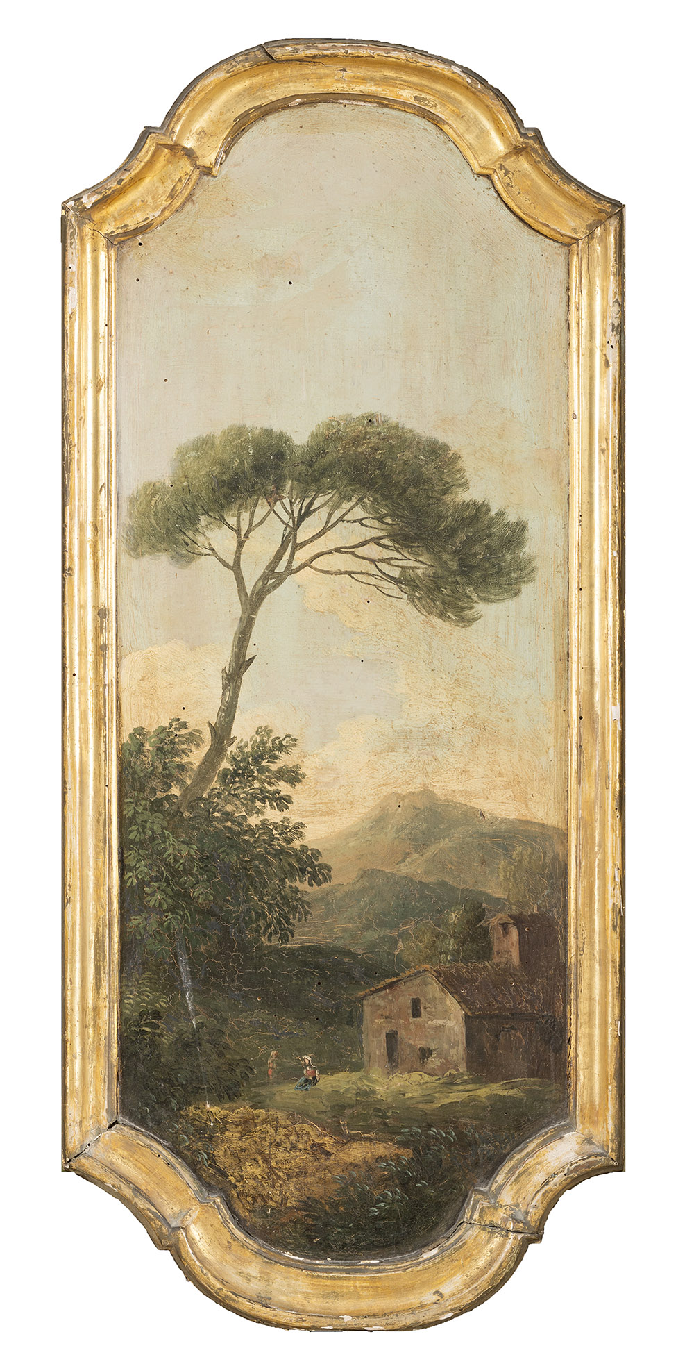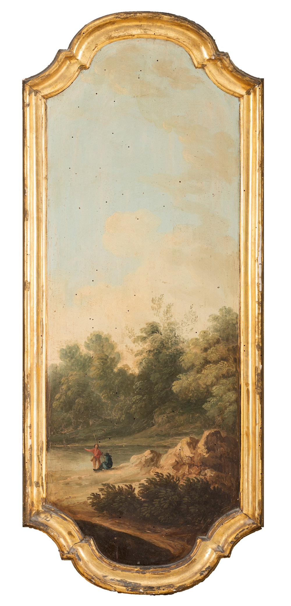 QUATTRO PANNELLI DOUBLE FACE , raffiguranti paesaggi ad olio su tavola , con cornice dorata cm 95 x 40, Italia XVIII secolo