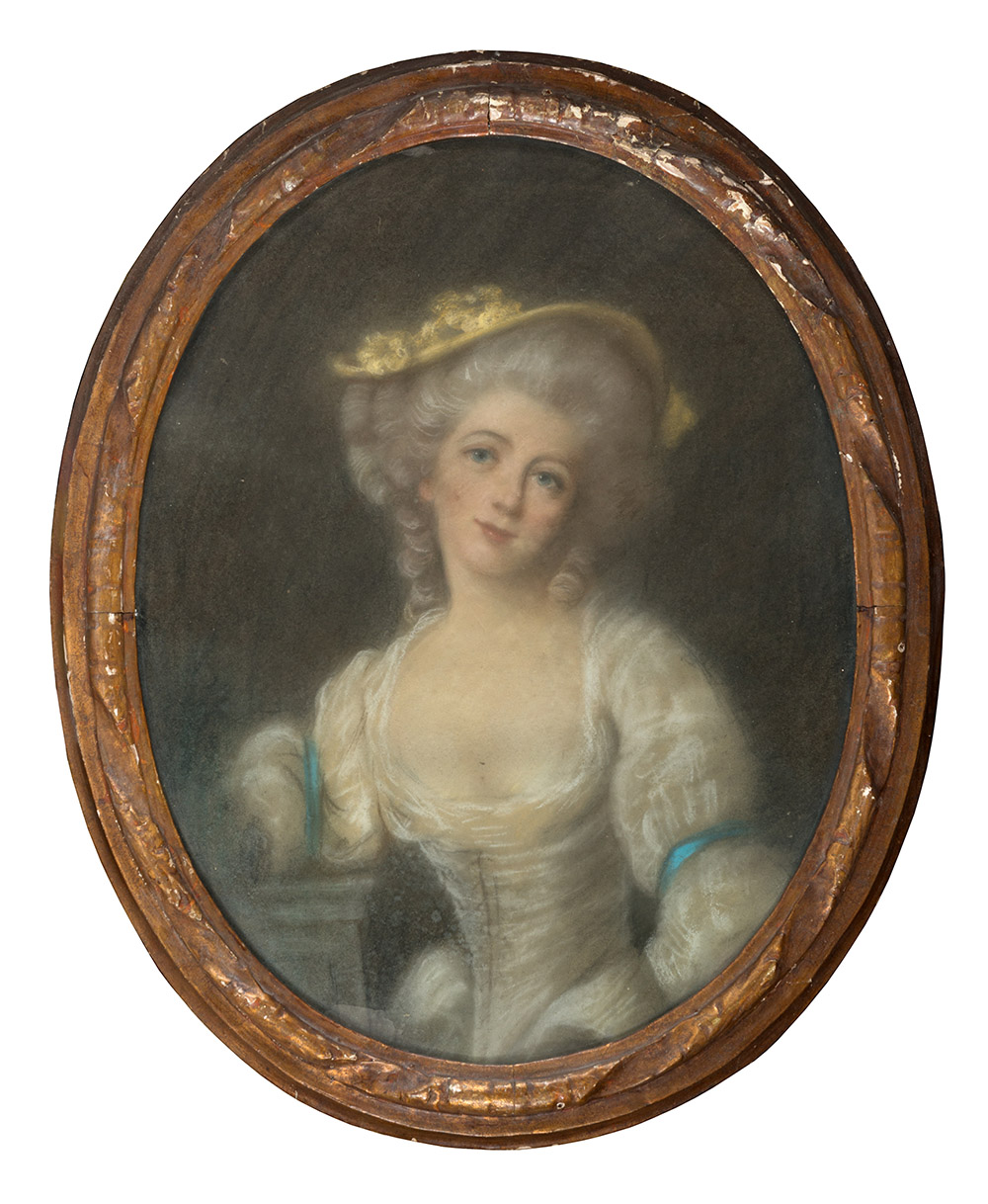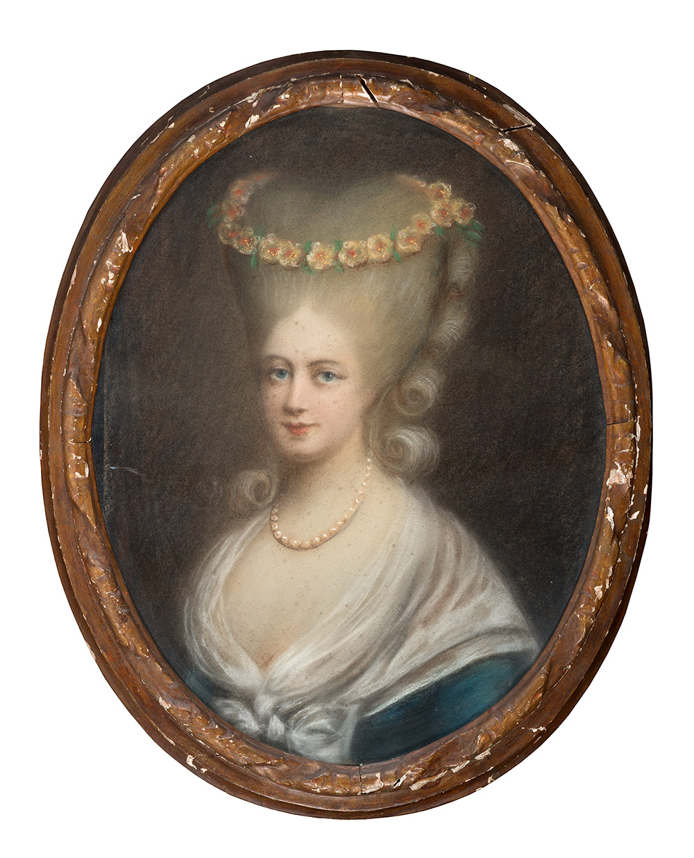 PITTORE ITALIANO XVIII SECOLO, Ritratto di donna con perle e tiara di fiori , Ritratto di donna con cappello, Due pastelli ovali su carta cm 67 x 52, Difetti
