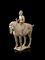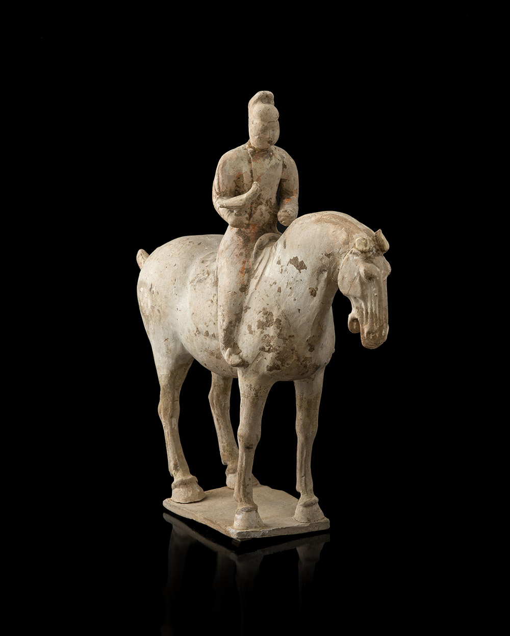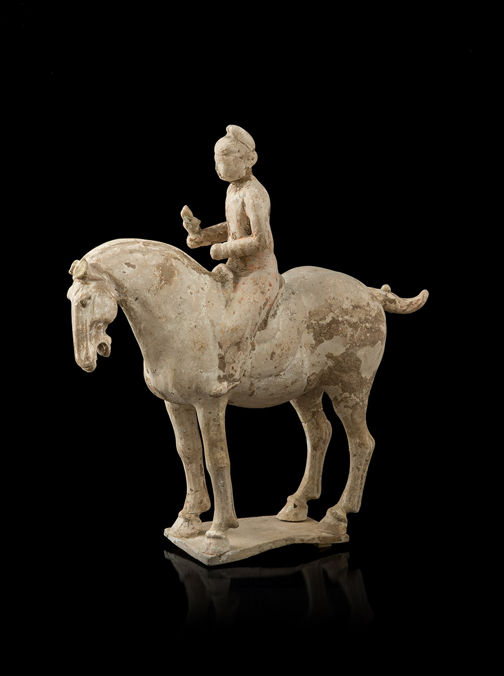 CAVALLO CON CAVALIERE CHE REGGE UCCELLINO TANG 618 - 907 D.C., Terracotta cm 38 x 38 x 12, Discreto - Buono stato di conservazione, Restauri al collo alla gamba posteriore e altri piccoli ritocchi, Certificazione e analisi di termoluminescenza eseguito da Arcadia - Tecnologie per i Beni Culturali di Renata Zelaschi & C., Prelievo effettuato sotto il ventre il 25 .03.1991