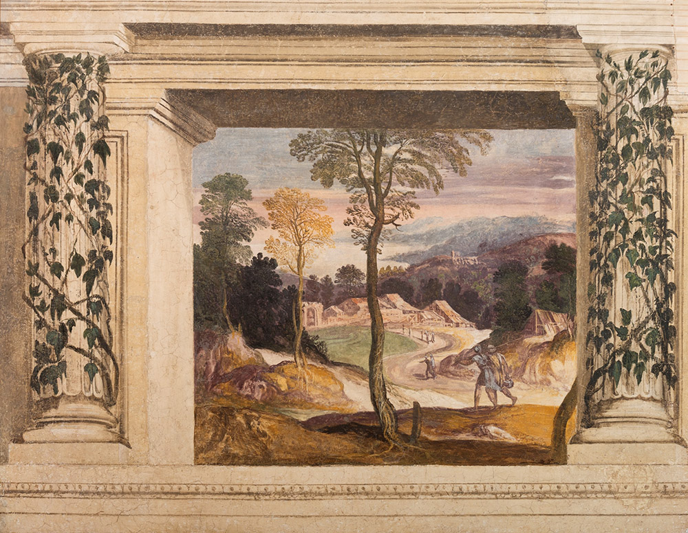 GIROLAMO MUZIANO, Brescia 1528 - Roma 1592, Paesaggio nei pressi del Castello di Rocca Sinibalda, Affresco riportato su tela poggiante su tavola cm 165 x 215, Mancante e difetti , Provenienza, Collezione privata Roma