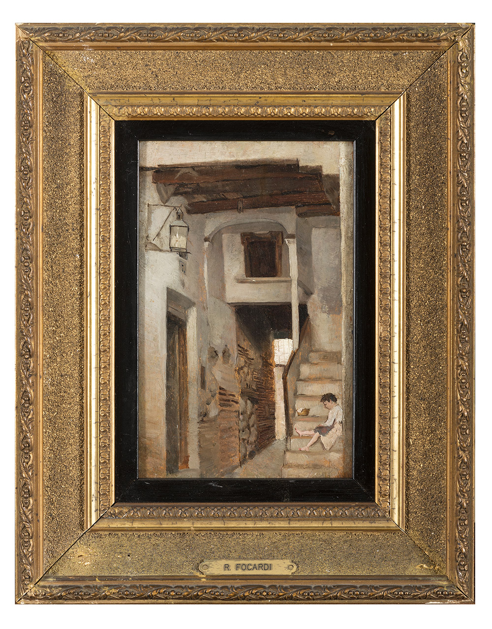 RUGGERO FOCARDI, Firenze 1864 - Livorno 1934, Vicolo a Settignano, Olio su tavoletta cm 22 x 14, Autentica su foto