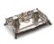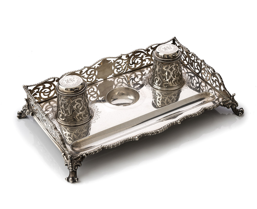 CALAMAIO IN ARGENTO, Vassio con laterali traforati a ramage, contenente due porta inchiostri sempre in argento, con decoro traforato ed inserti in vetro, porta pennini al centro e porta penna sul davanti , Punzone Inghilterra sotto la base, cm 6 x 31 x 21 peso gr 1257