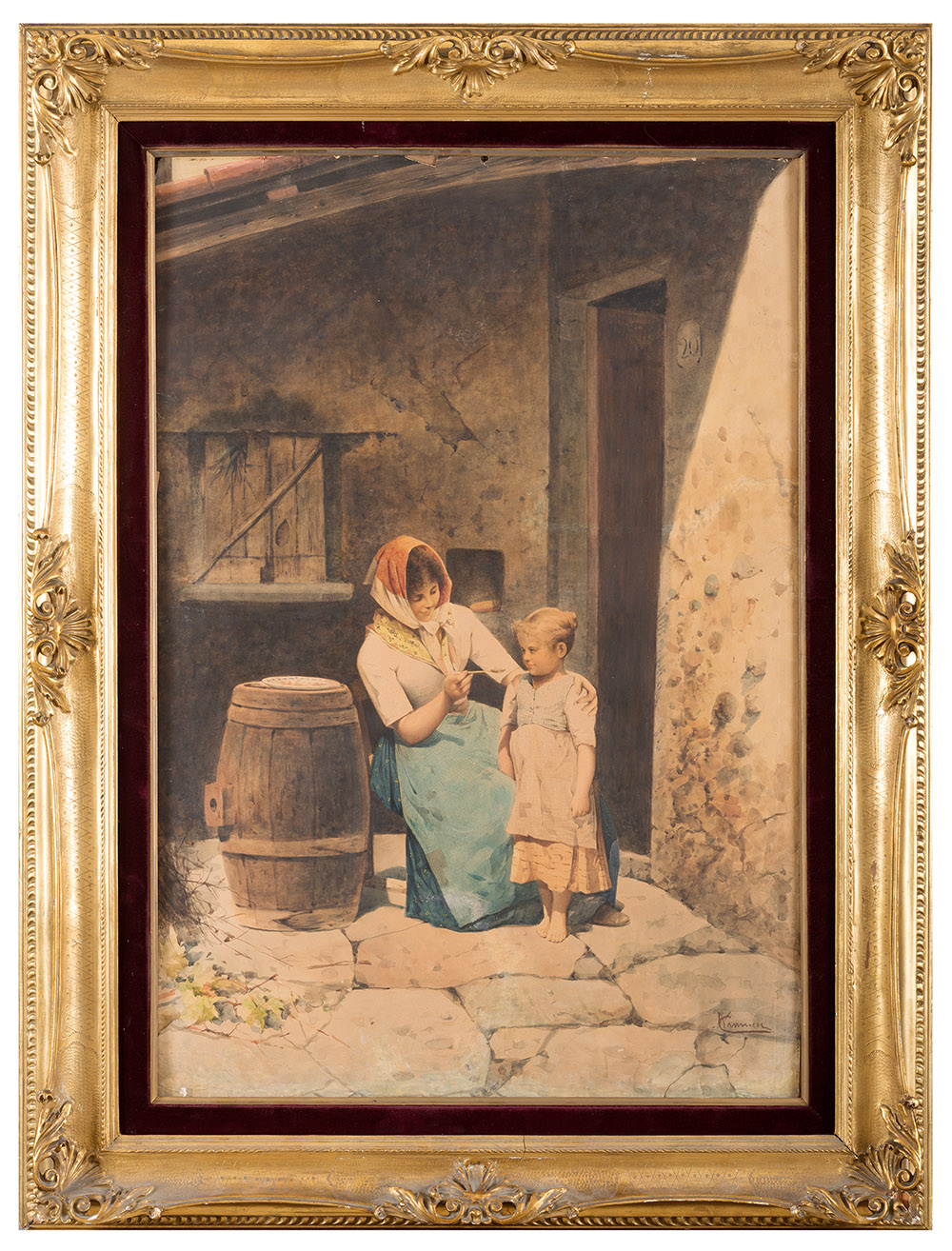 NICCOLO' CANNICCI , Firenze 1846 - 1906, La pappa, Acquerello su cartoncino cm 83 x 57 , Firma in basso a destra, Lievi difetti