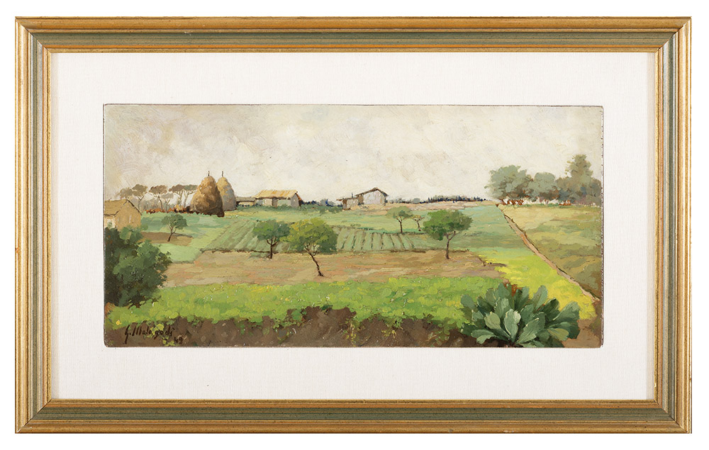 GIOVANNI MALAGODI , Londra 1904 - Roma 1991, Paesaggio della Caffarella presso Roma 1949, Olio su tavoletta cm 21 x 42, Firma e data in basso a sinistra, Titolo al retro