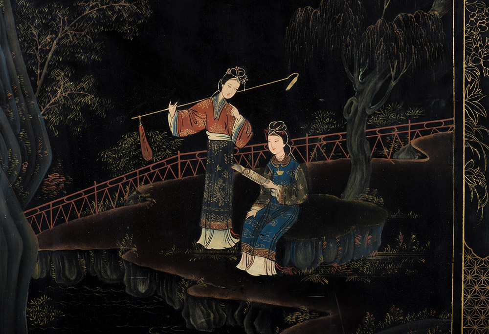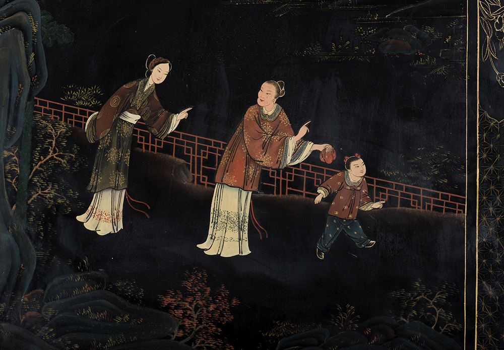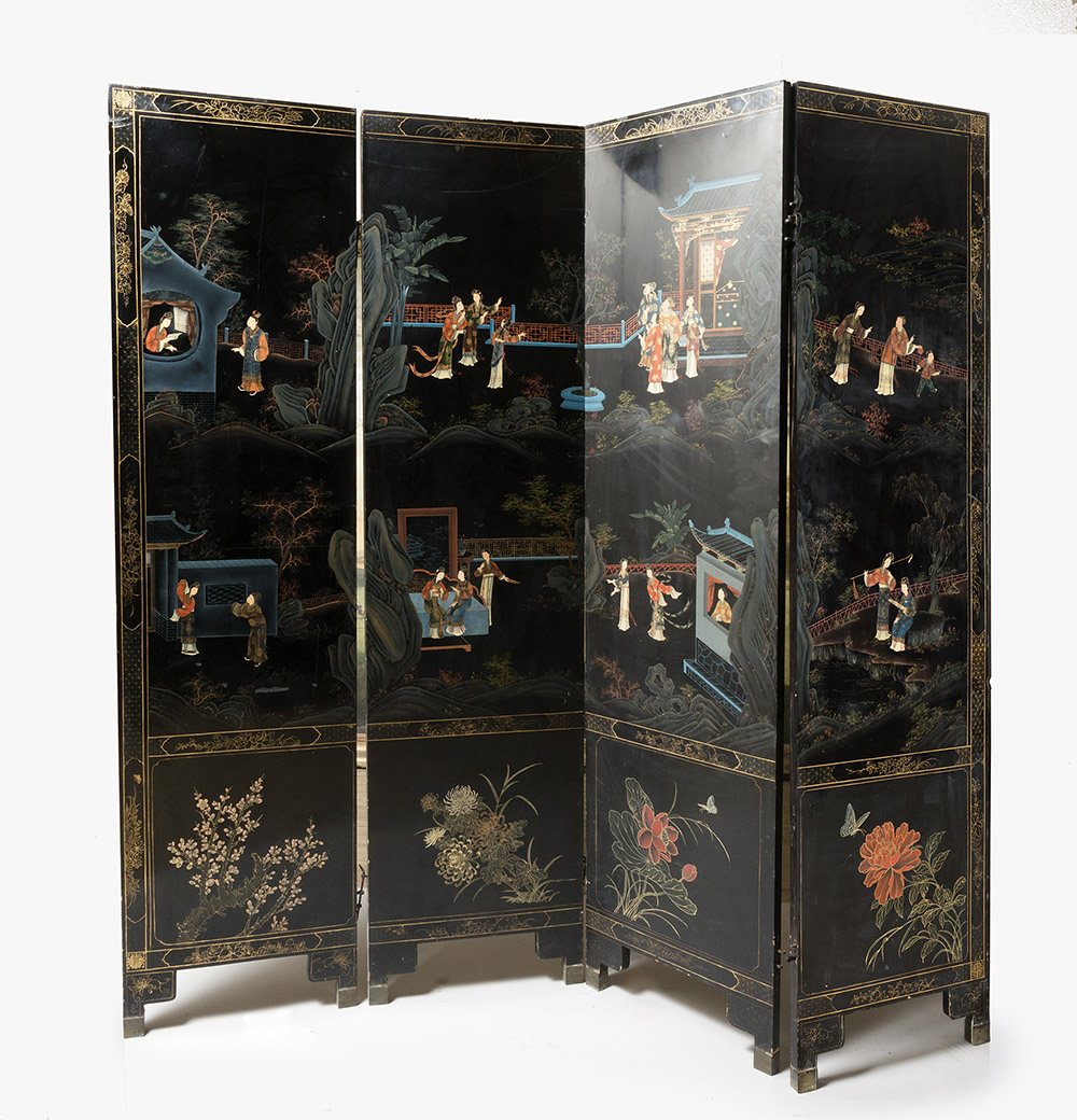 PARAVENTO CINESE INIZI XX SECOLO, in legno laccato e dipinto a quattro ante , Misure cm 183 x 180, Lievi difetti