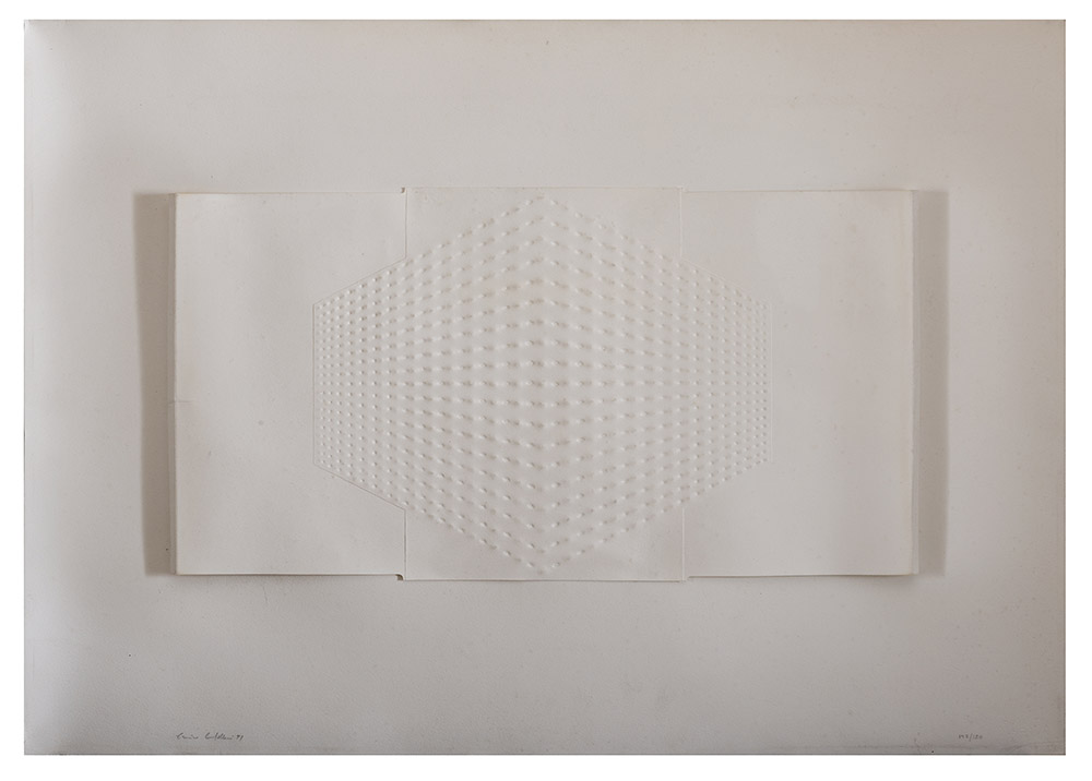 ENRICO CASTELLANI, Castelmassa 1930, Superficie bianca 1971, Impressione a secco e calcografia es 143/150, Misure del foglio cm 52, 5 x 74, Firma e data in basso a sinistra, Pubblicazioni , L. Magini 1960 - 1995 ed. Corraini, Mantova, 1996 n. 50