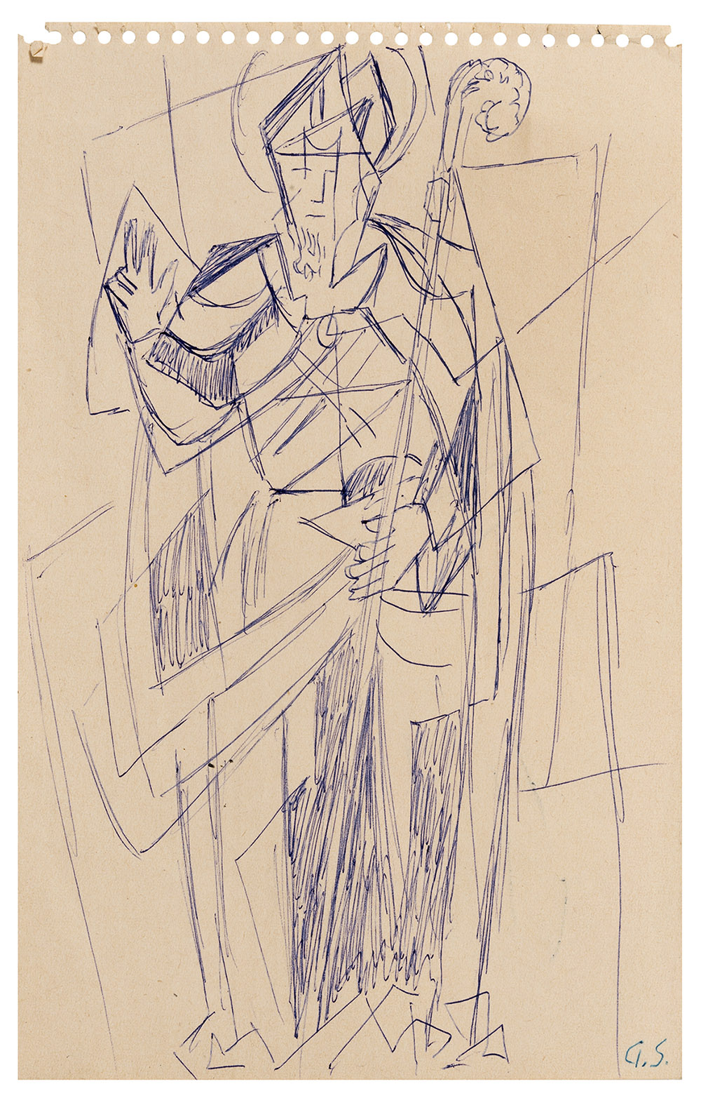GINO SEVERINI, Cortona 1883 - Parigi 1966, San Nicolò 1958, Studio per il dipinto sito a Cortona, a penna su carta cm 21 x 13, 5, Siglato in basso a destra , Provenienza, Acquisito dall'attuale proprietà da Casa Severini Roma, Visionate con esito positivo da Archivio Severini, 09 maggio 2016, ed è a vs. disposizione per stilare l'autentica