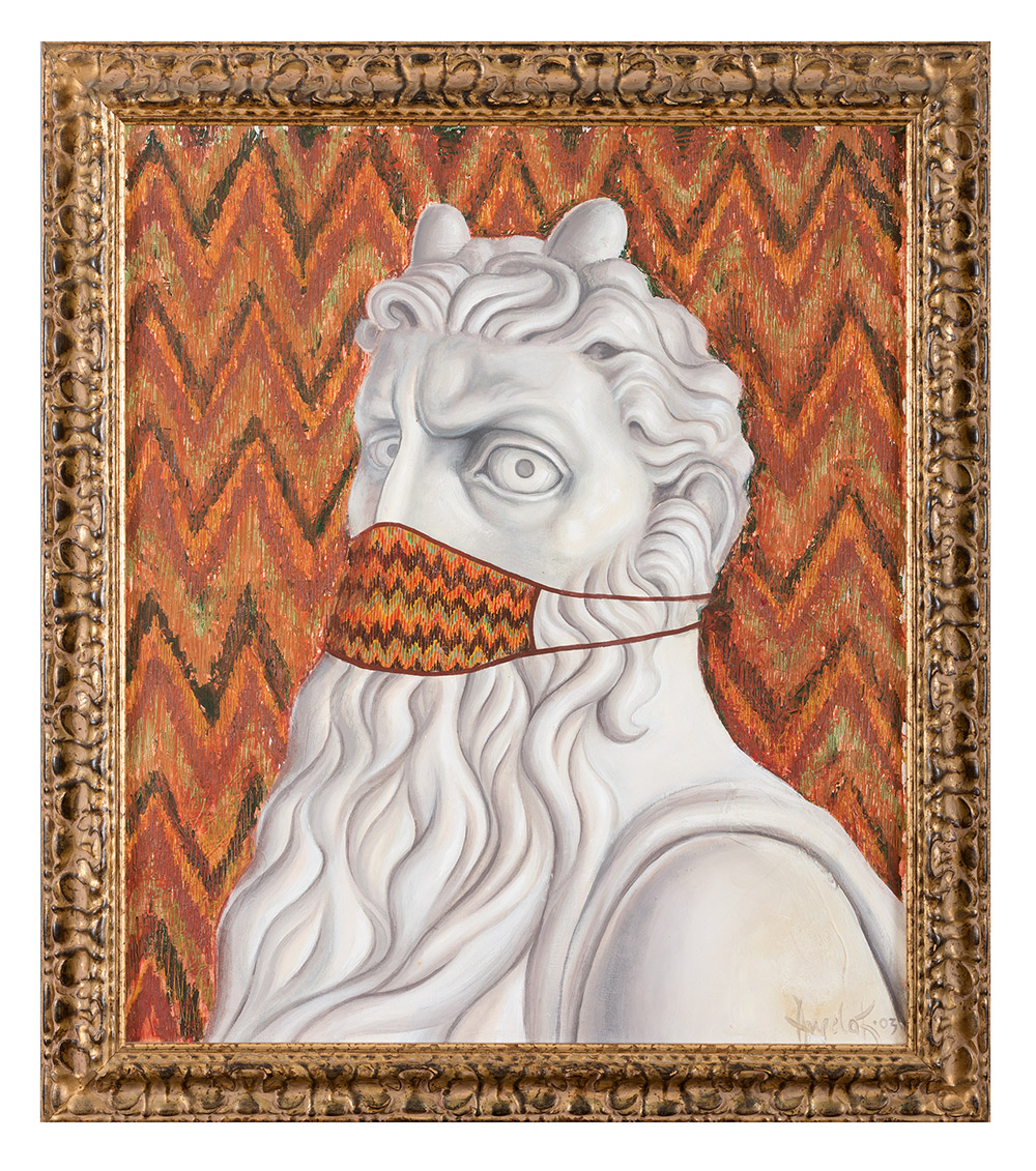 ANGELINA KUZMANOVIC, Negotin 1968, Precauzione griffata 2003, Olio su tela cm 70 x 60, Firma e data sul verso in basso a destra
