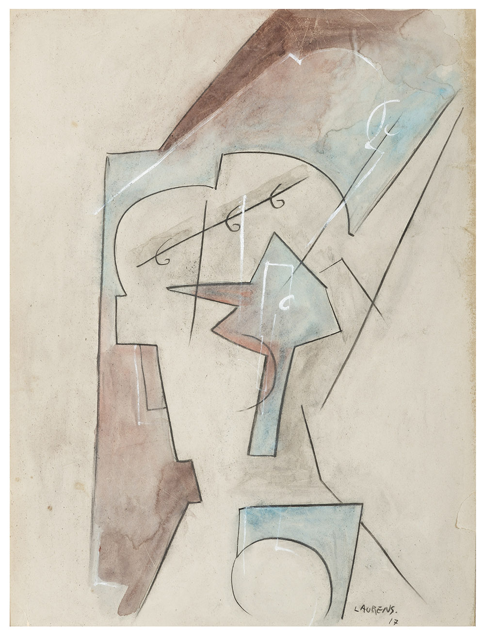HENRI LAURENS, Parigi 1885 - 1954, Astratto 1917, Tecnica mista su cartoncino cm 56 x 42, Firma e data in basso a destra, Difetti alla carta
