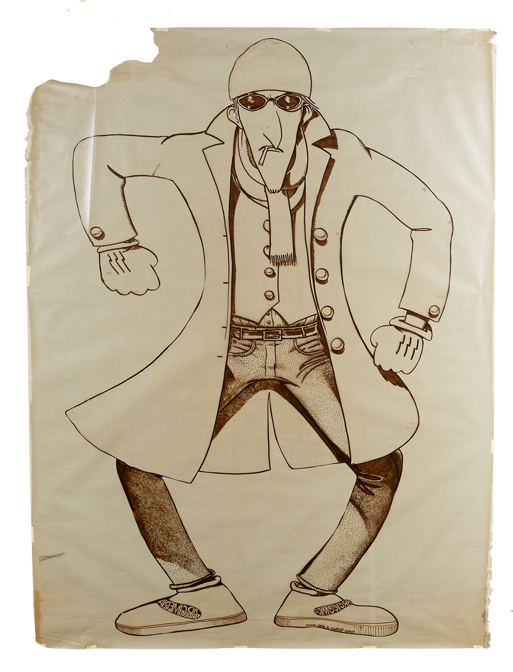 ANDREA PAZIENZA, San Benedetto del Tronto 1956 - Montepulciano 1988, Senza titolo - uomo con occhiali , Tecnica mista su carta lucida cm 170 x 118, Firma in basso a destra, Difetti e rotture alla carta, Parere positivo verbale sull'autenticità di Maria Comandini Pazienza
