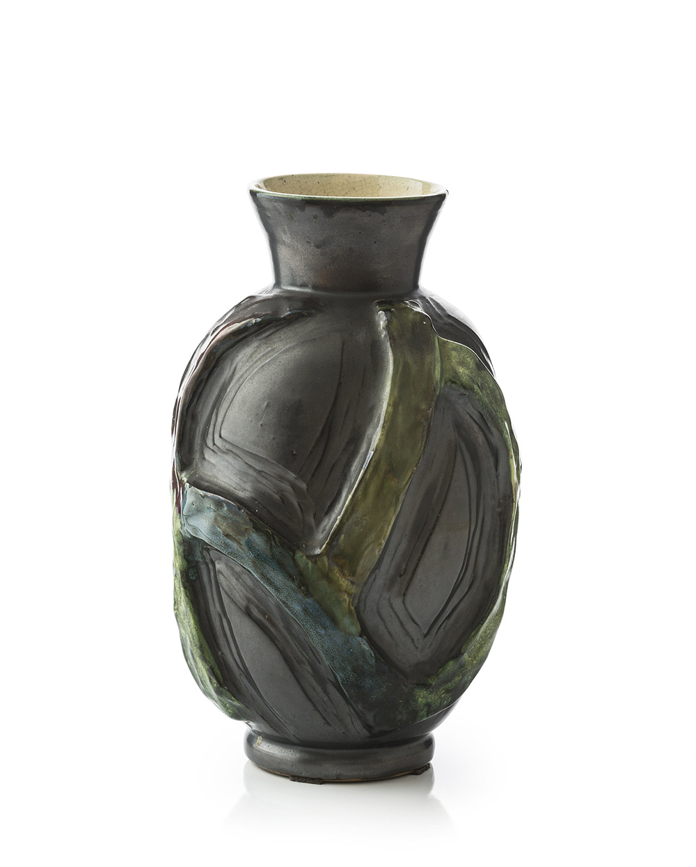 VASO IN CERAMICA , Corpo a lustro con riquadri irregolari , delimitati da rilievi in smato policromo, Marcato S , 1930 ca, h. cm 32
