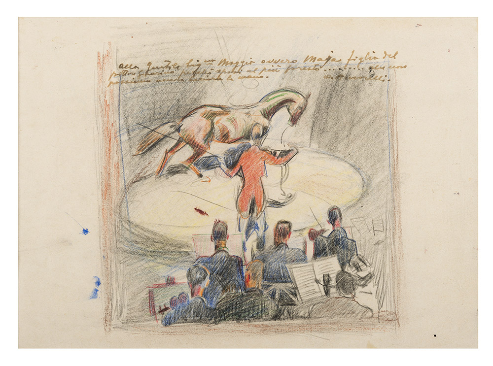 ALFONSO AMORELLI, Sambuca Zabut 1898 - Palermo 1969, La cavallina, Matite colorate su carta applicata su tela cm 20 x 28, Dedica e firma in alto