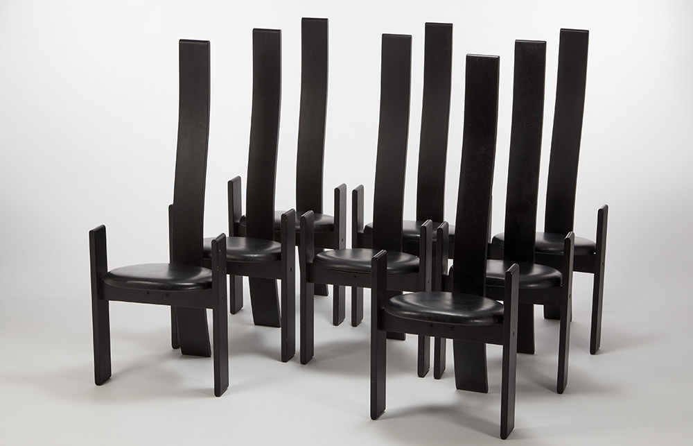 Vico Magistretti ( 1920 - 2006) Otto sedie modello "Golem". Produzione Poggi, Pavia 1969 ca. Legno laccato nero, sedili rivestiti in pelle nera (cm 50x126x55) (lievi difetti) Bibliografia: "Domus", n. 488, luglio 1970, p. 34; G. Gramigna, Repertorio del design italiano 1950-2000 per l'arredamento domestico, vol. 1, Allemandi, Torino 2003, p. 136 Eight chairs model "Golem". Produced by Poggi, Pavia, circa 1969. Black lacquered wood, black leather lining (cm 50x126x55) (minor defects) Bibliography: "Domus", n. 488, luglio 1970, p. 34; G. Gramigna, Repertorio del design italiano 1950-2000 per l'arredamento domestico, vol. 1, Allemandi, Torino 2003, p. 136