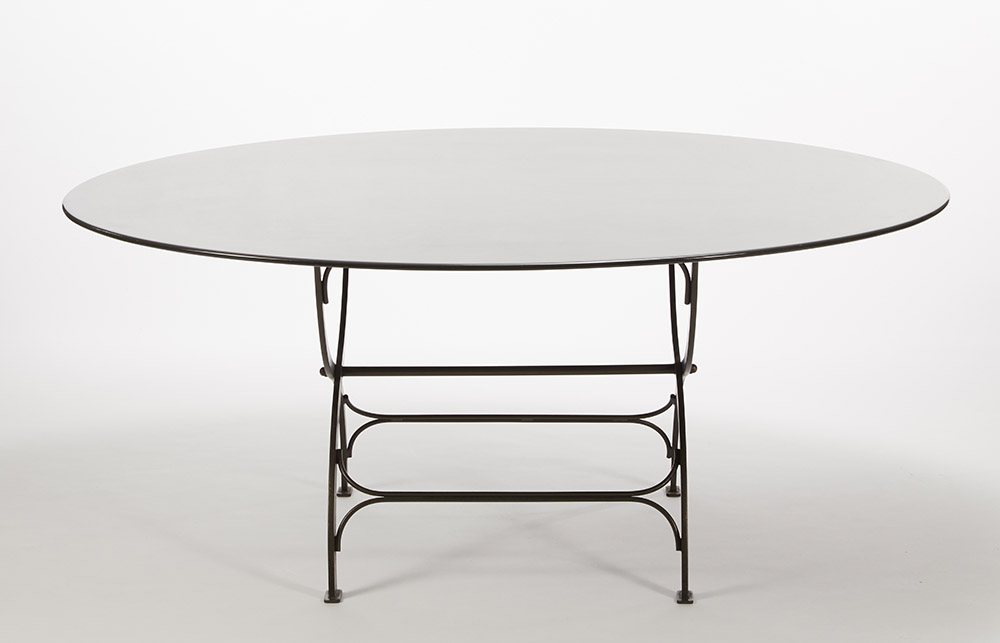 Luigi Caccia Dominioni ( 1913) Tavolo ovale modello "T14 Nonaro". Produzione Azucena, Milano 1961. Struttura in ferro grigio metallizzato, piano in legno laccato grigio (cm 170x140x73) (lievi difetti) Oval table model "T14 Nonaro". Produced by Azucena, Milan, 1961. Metal grey iron structure, grey lacquered wooden top (cm 170x140x73) (minor defects)