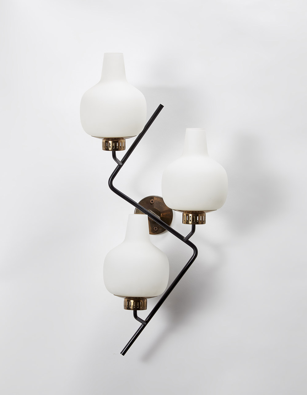 Stilnovo Applique a tre fiamme in metallo laccato nero, ottone e vetro lattimo incamiciato e acidato sulla superficie esterna. Milano anni 50 (h cm 56) Three lights wall lamp. Black lacquered metal, brass, cased milk glass. Milan, 1950s (h cm 56)