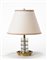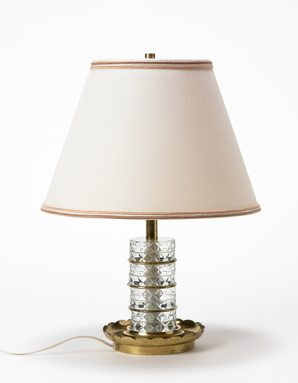 Gino Sarfatti (attribuito) Abat-jour in ottone con fusto decorato da dischi di cristallo molato di forte spessore. Paralume in tessuto. Probabile produzione Arteluce, Milano anni 40 (h cm 48) (lievi difetti) Abat-jour. Brass, crystal, fabric. Probably produced by Arteluce, Milano, 1940s (h cm 48) (minor defects)